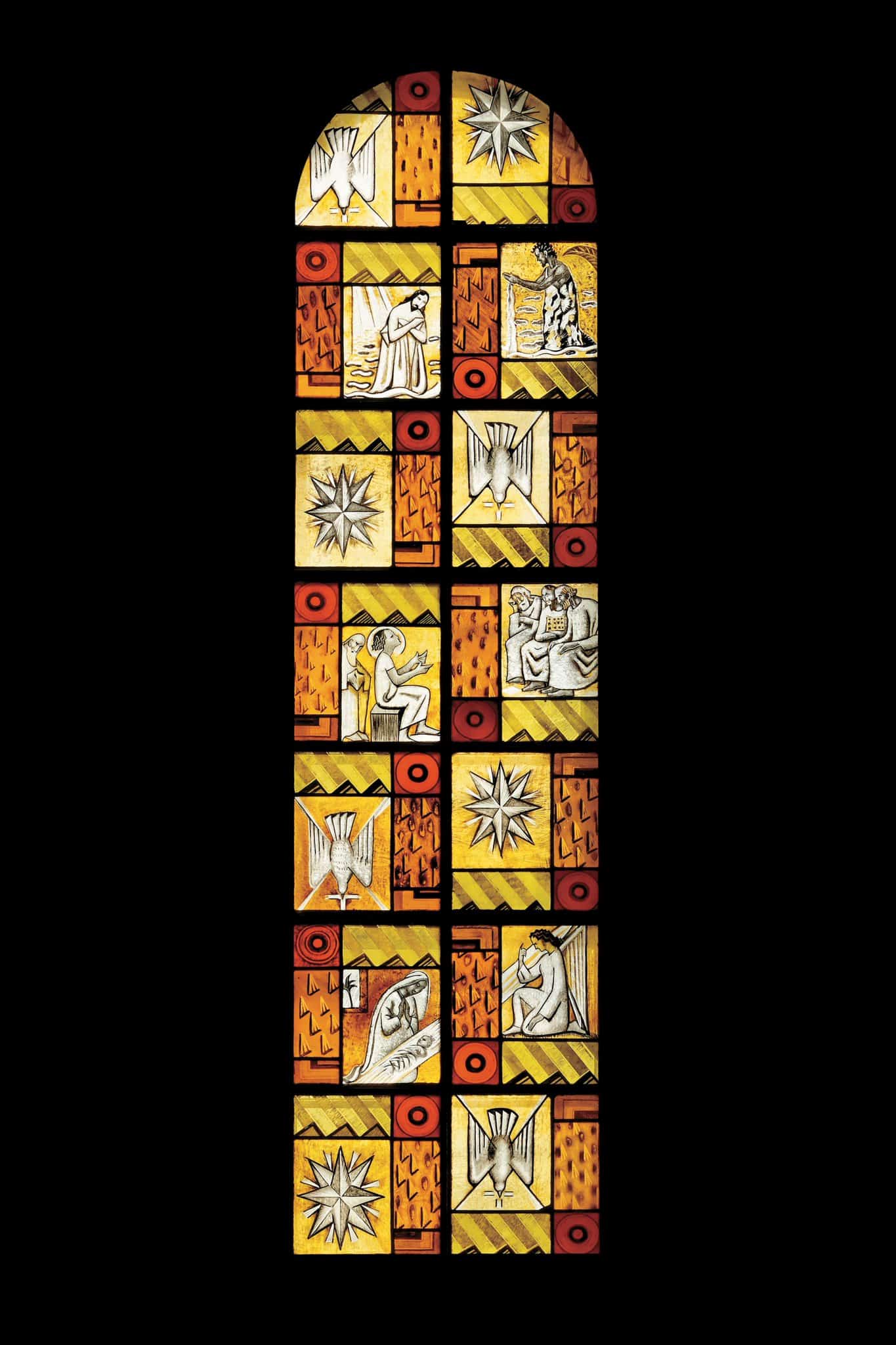 Des rectangles décoratifs s’alternent à des rectangles illustrant des scènes de la vie du Christ. De haut en bas: Jean baptise le Christ dans les eaux du Jourdain, Jésus au milieu des docteurs, l’Annonciation. Une étoile et une colombe apparaissent entre chaque scène.