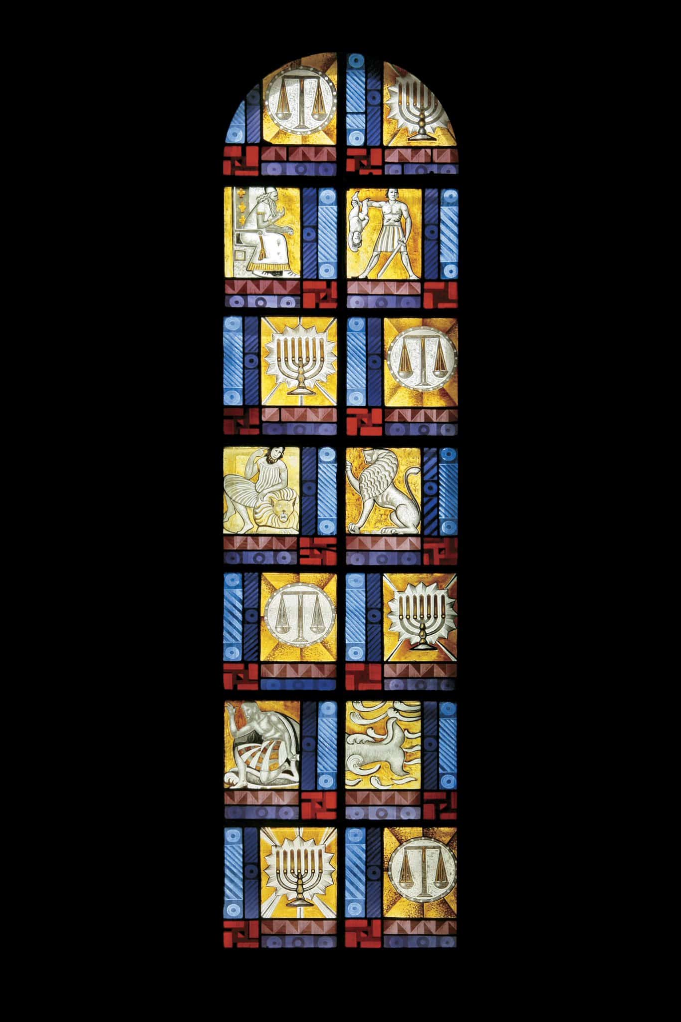 Des rectangles décoratifs s’alternent à des rectangles illustrant des scènes de l’Ancien Testament. De haut en bas: le Jugement de Salomon, Daniel au milieu des lions, Jonas sortant de la baleine. Une balance et un chandelier apparaissent entre chaque scène.