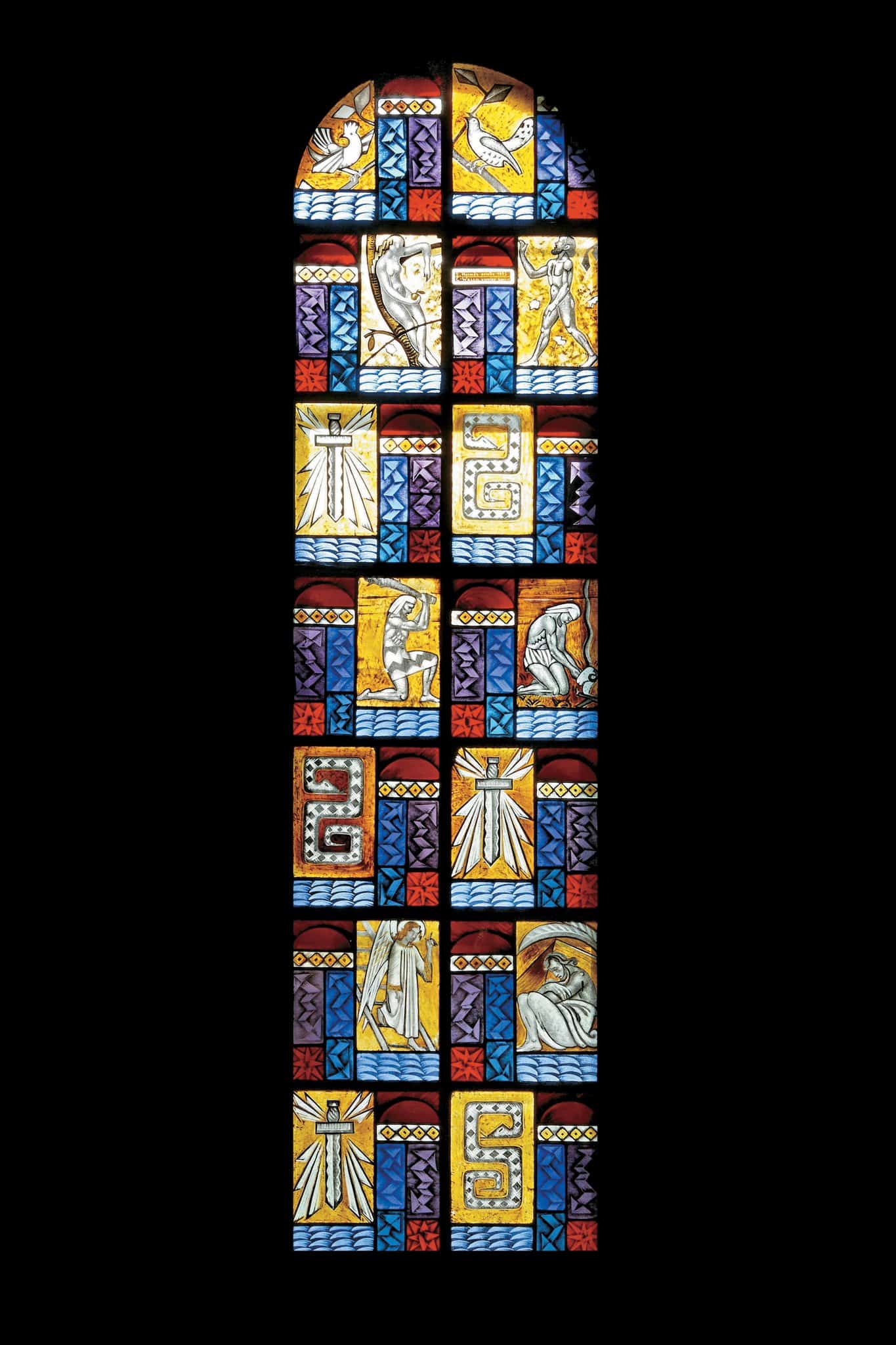 Des rectangles décoratifs s’alternent à des rectangles illustrant des scènes de la Genèse. De haut en bas : Adam et Eve, Caïn et Abel, le songe de Jacob. Une épée flamboyante et un serpent apparaissent entre chaque scène.