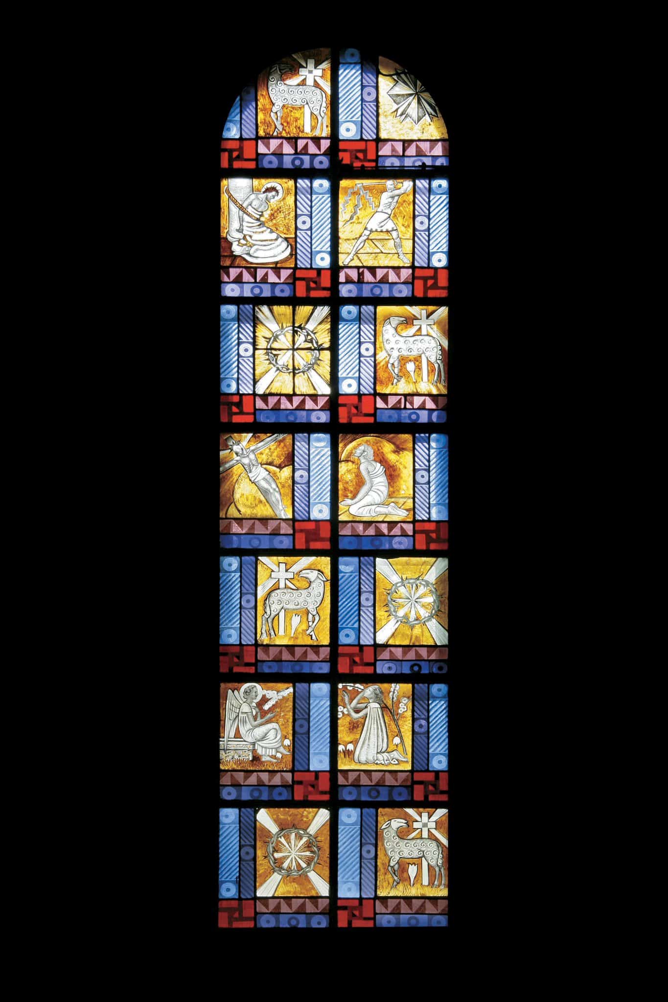 Des rectangles décoratifs s’alternent à des rectangles illustrant des scènes de la Passion du Christ. De haut en bas : la flagellation, la crucifixion, l’ange au tombeau apparaissant à Madeleine. L’Agneau de Dieu et la couronne d’épines apparaissent entre chaque scène.