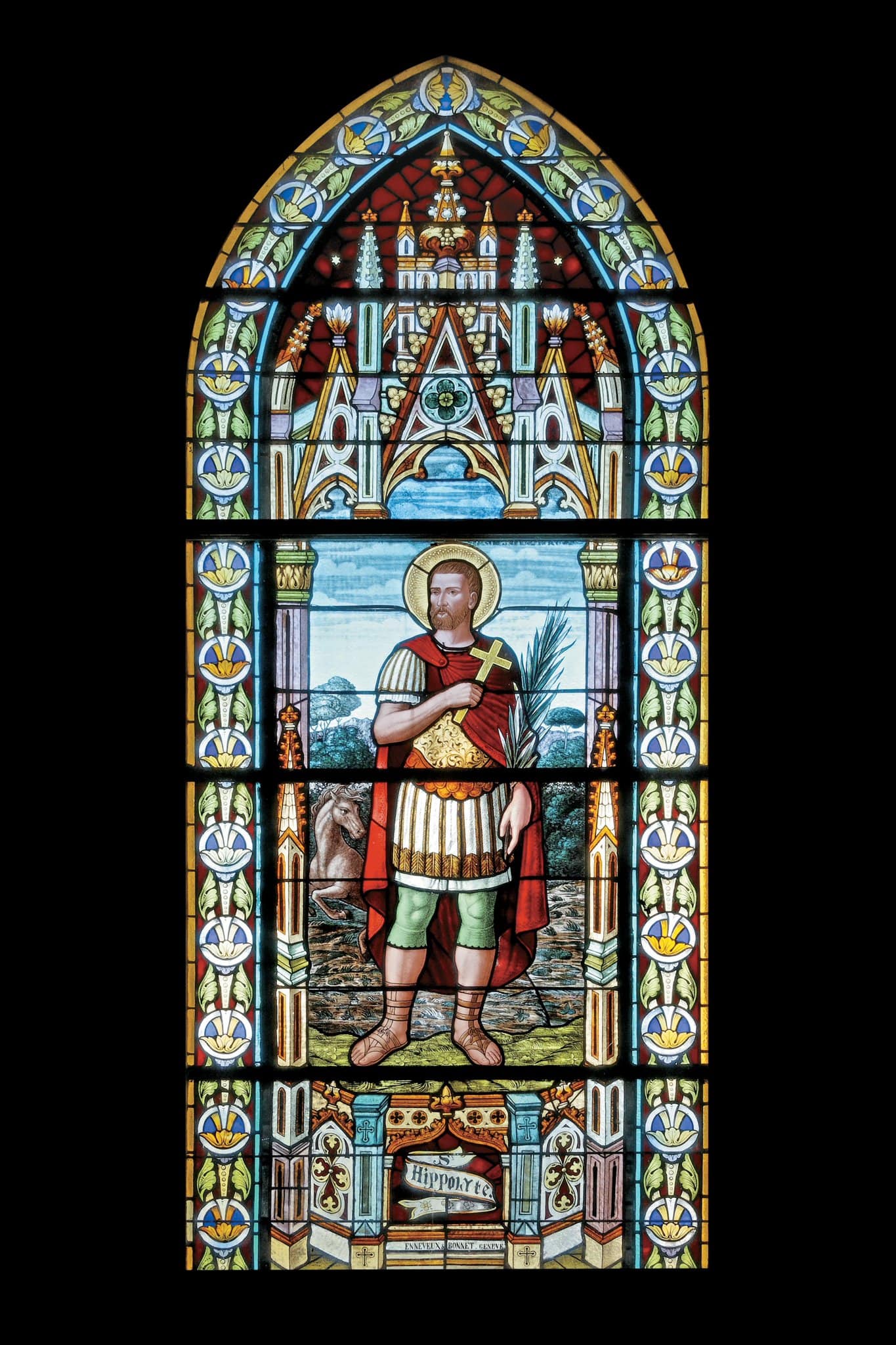 Saint Hippolyte, habillé en soldat romain, porte une croix et une palme. Derrière lui, un cheval se cabre.