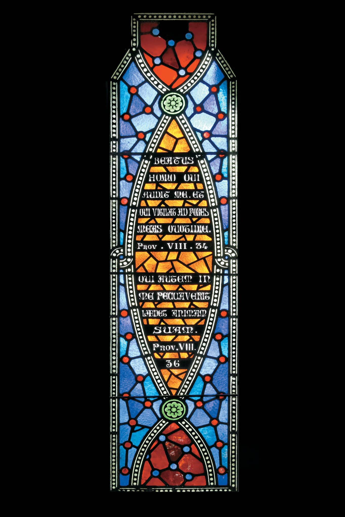 BEATUS / HOMO QUI / AUDIT ME ET / QUI VIGILAT AD FORES / MEAS OUOTIDIE / PROV. VIII.34 / QUI AUTEM IN / ME PECCAVERIT / LAEDET ANIMAM / SUAM / PROV. VIII 36 (dans la mandorle)