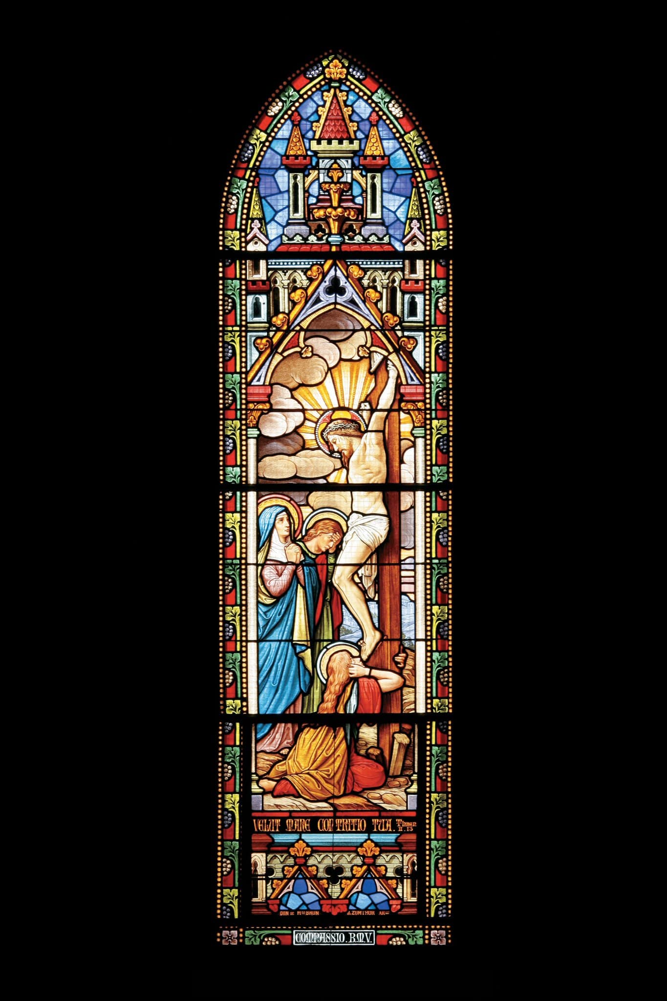 VELUT MARE CONTRITIO TU Thren.II.13 (bandeau sous la scène) / DON DE MRS BRUN & ZUMTHOR ARTES (bandeau en bas au centre) / COMPASSIO B.M.V. (cartouche sur la bordure en bas au centre)
