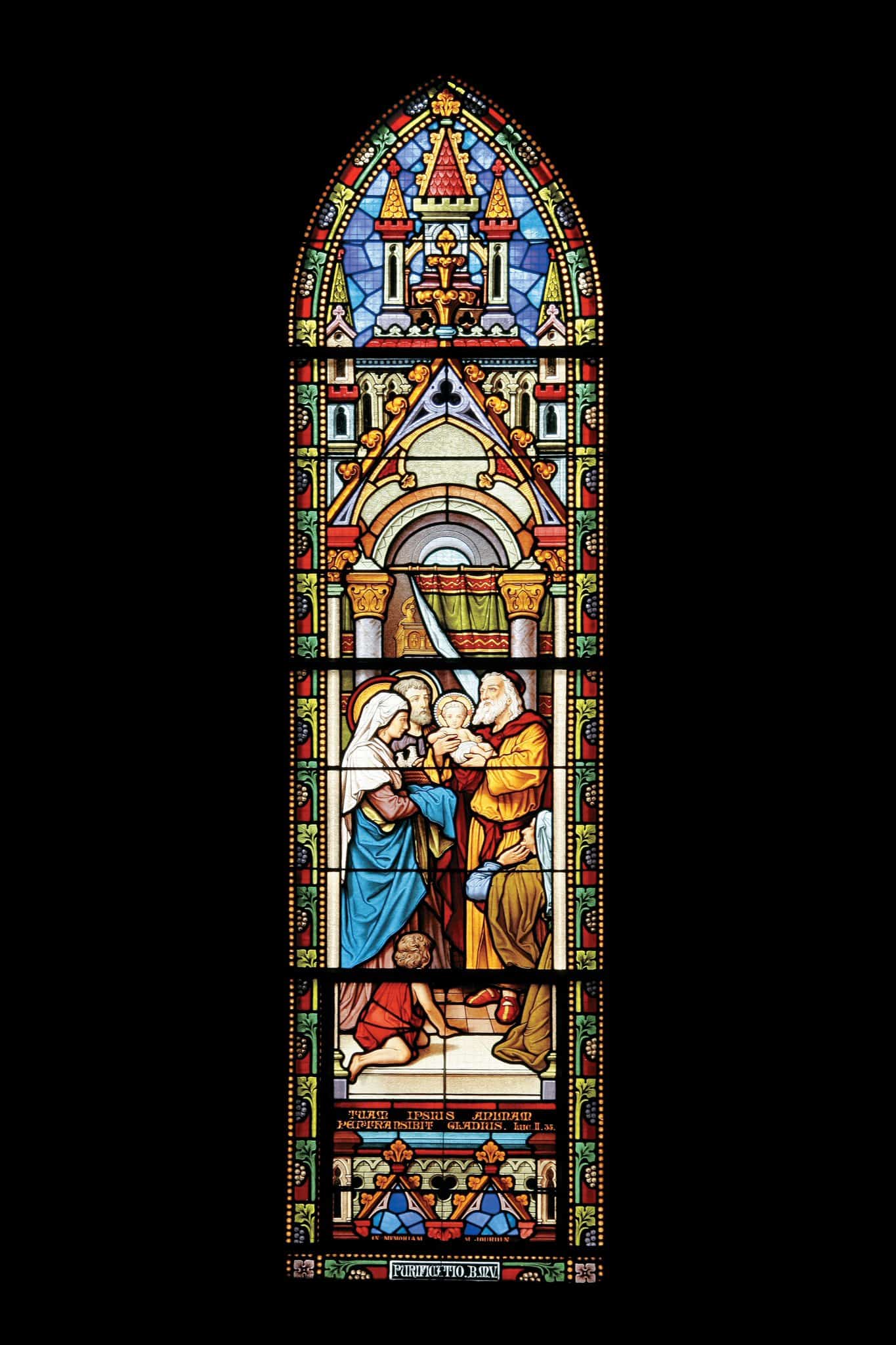 TUAM IPSIUS ANIMAM / PERTRANSIBIT GLADIUS. LUC II.35 (b. scène) / IN MEMORIAM M. JOURDIN (bandeau sous la scène) / PURIFICATIO B.M.V. (cartouche sur la bordure en bas au centre)
