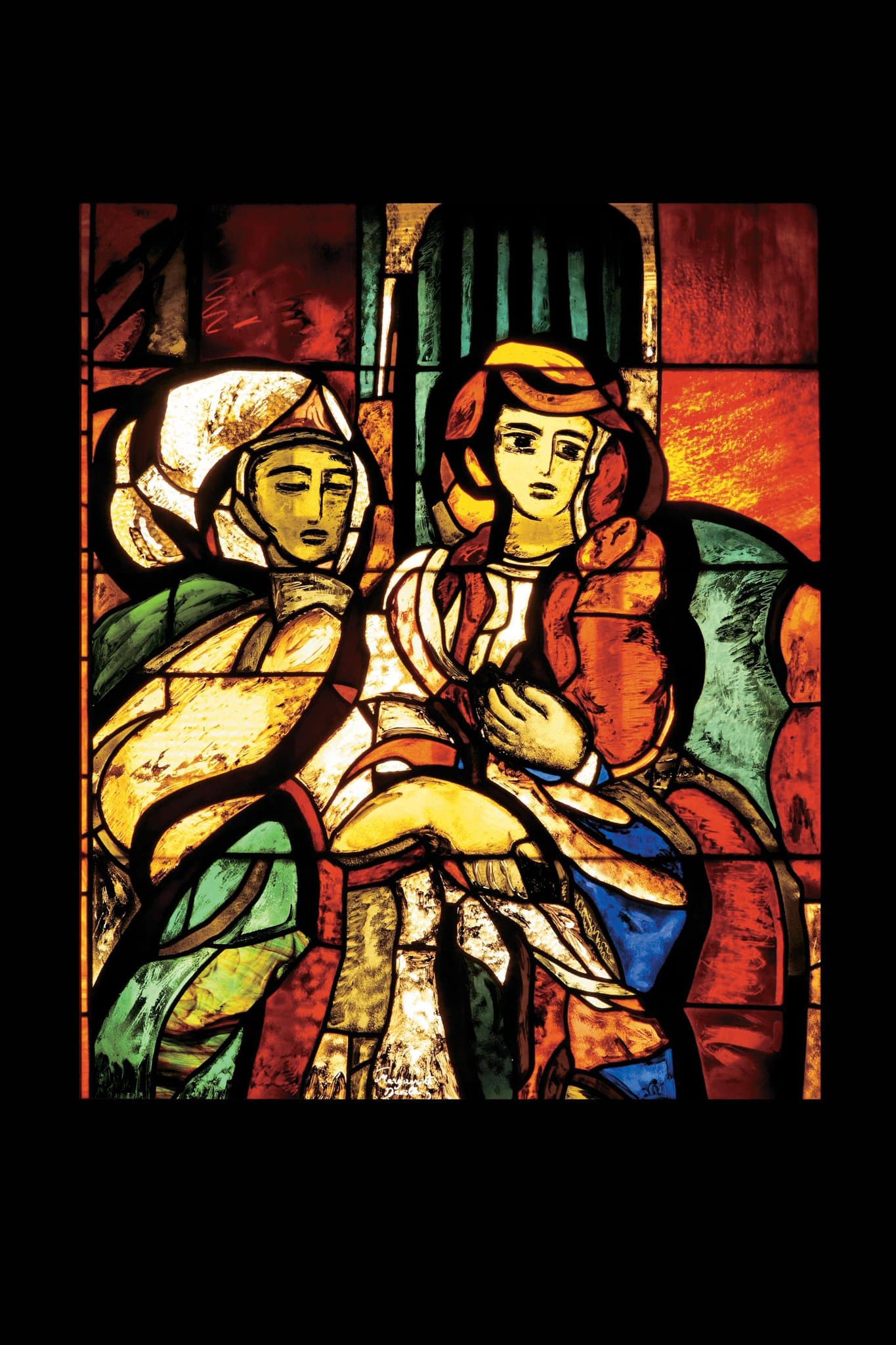 Une Vierge sage, vêtue de blanc et la tête voilée, est à côté d’une Vierge folle habillée de couleur vive et tête nue.