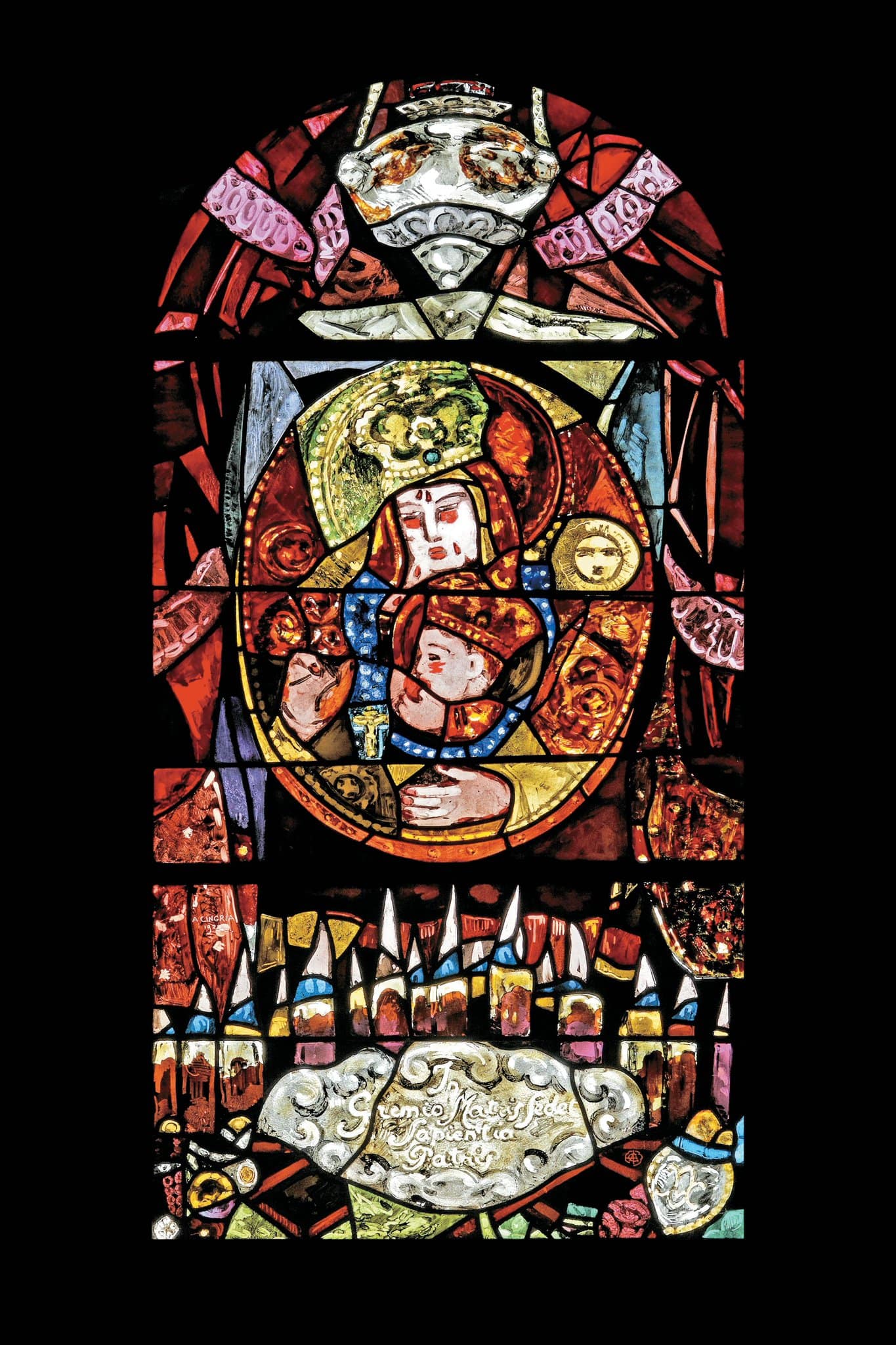 Ce vitrail est une transcription d’une image miraculeuse se trouvant dans l’église à Ré Ossola en Italie.