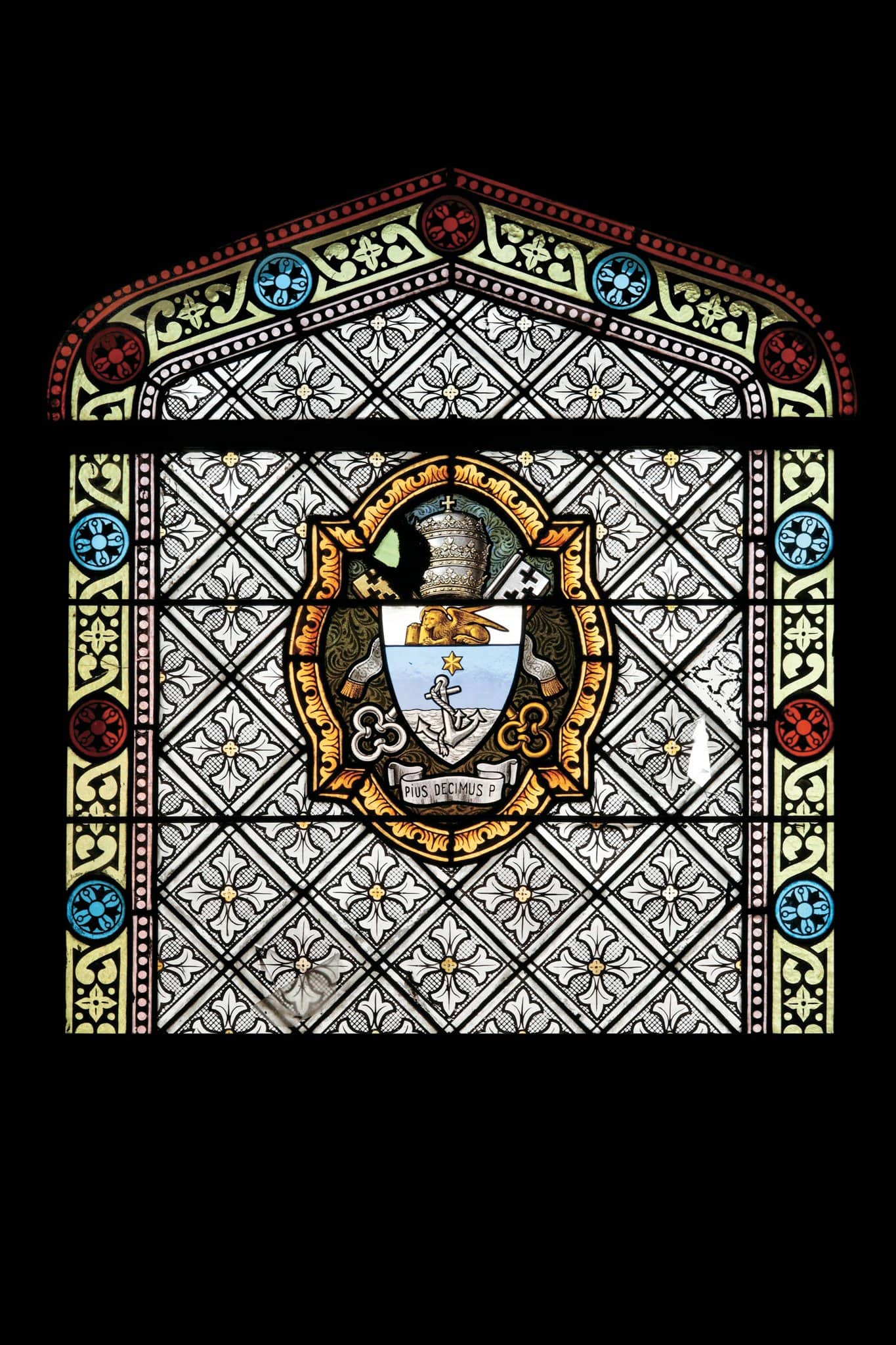 Au milieu d’un vitrail décoratif, les armoiries papales
