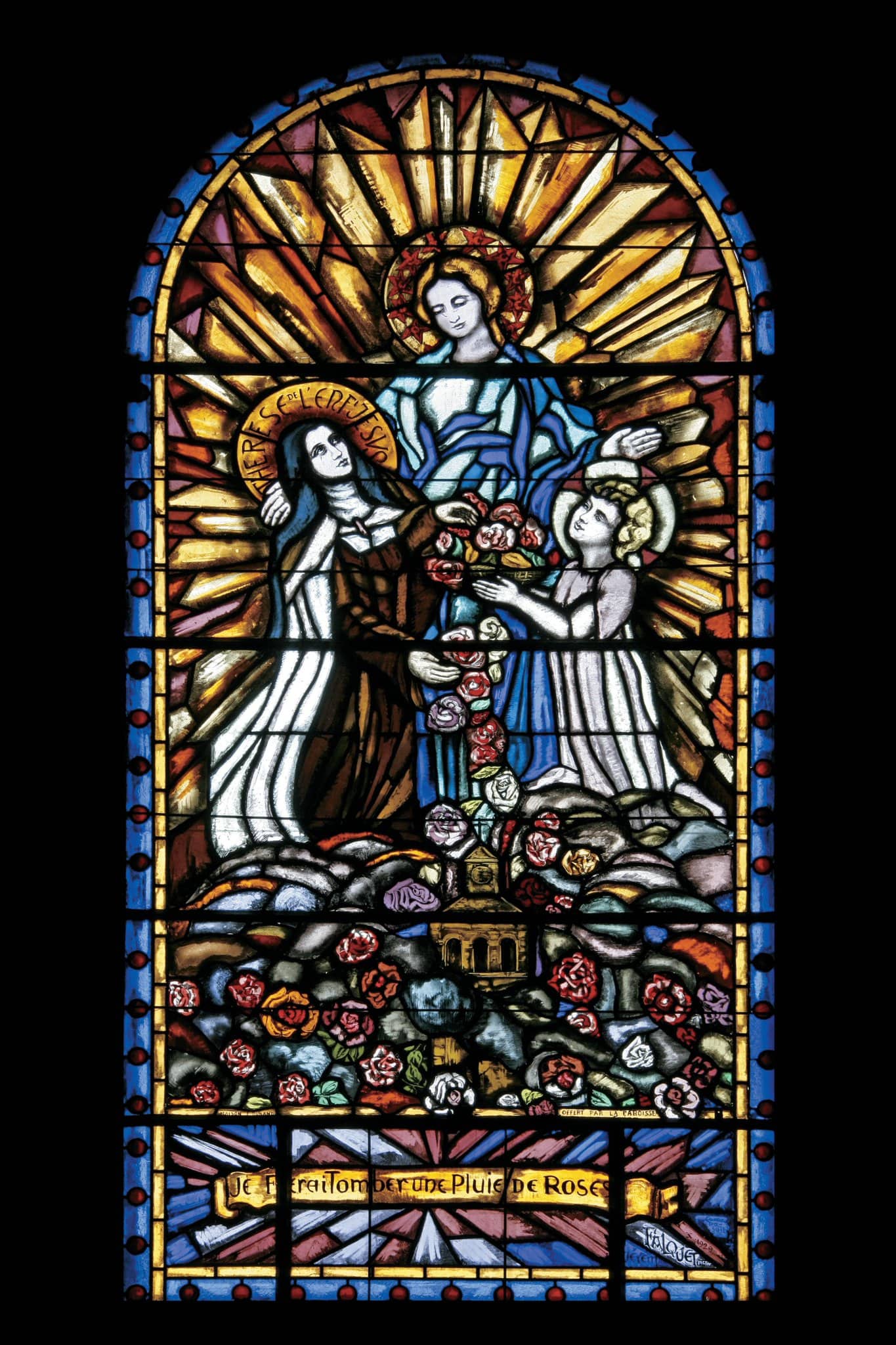 THERESE DE L’ENF’ JESVS (nimbe) / OFFERT PAR LA PAROISSE (au pied de la scène à droite) / Je Ferai Tomber une Pluie de Roses (banderole en bas au centre)