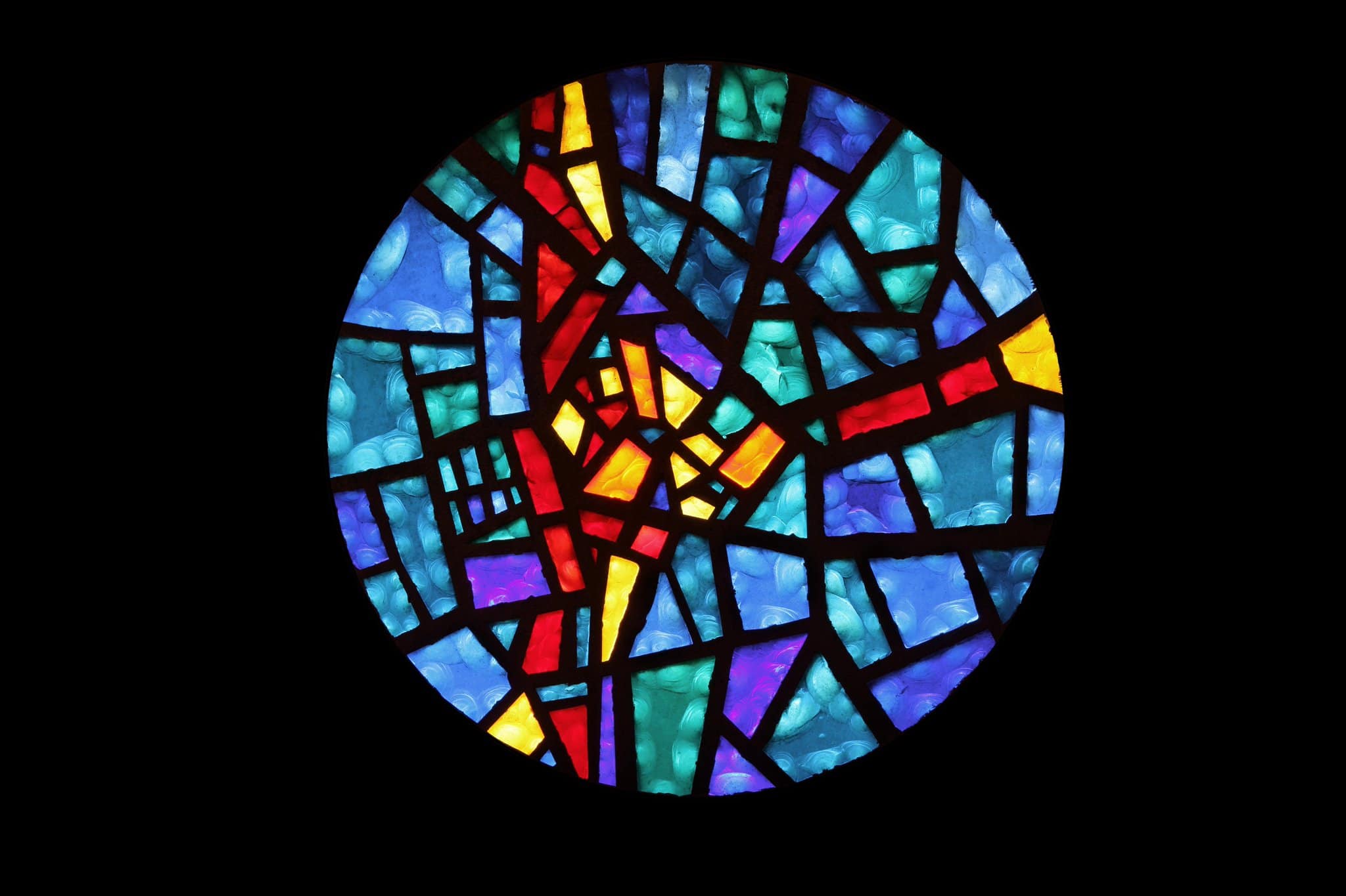 Une rosace non figurative composée de verres taillés aux teintes bleues, jaunes et rouges.