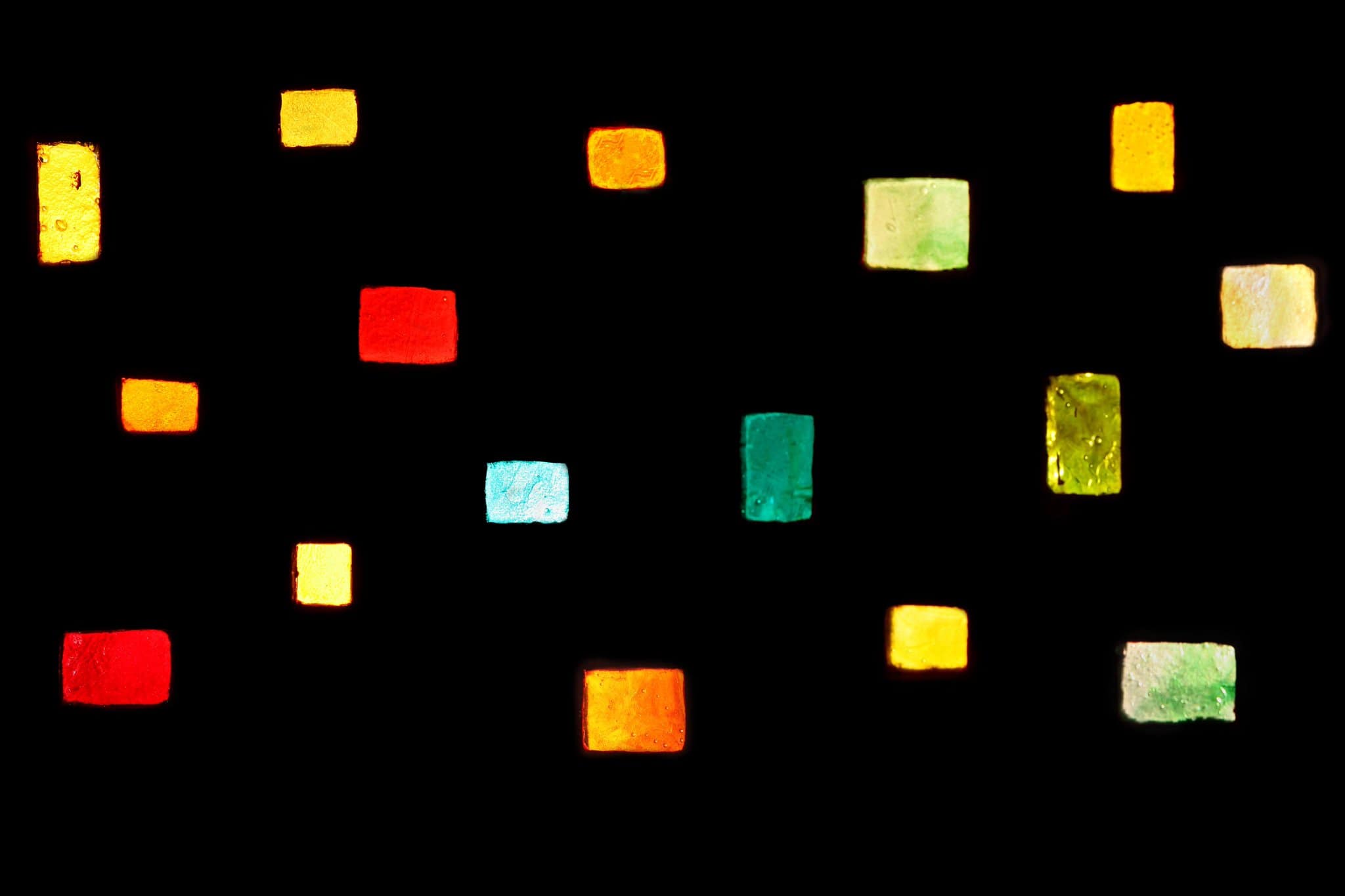 Verres rectangulaires oranges, verts et jaunes insérés dans une paroi de ciment.