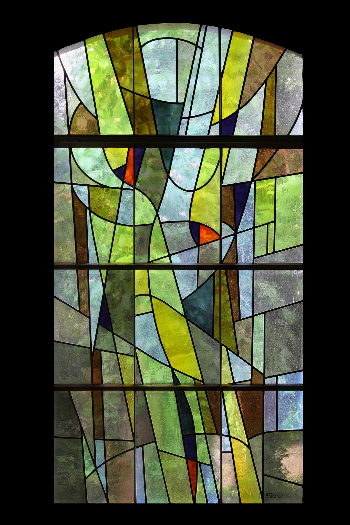 Vitrail non figuratif composé de verres aux teintes transparentes jaunes, brunes, violettes, oranges et blanches.