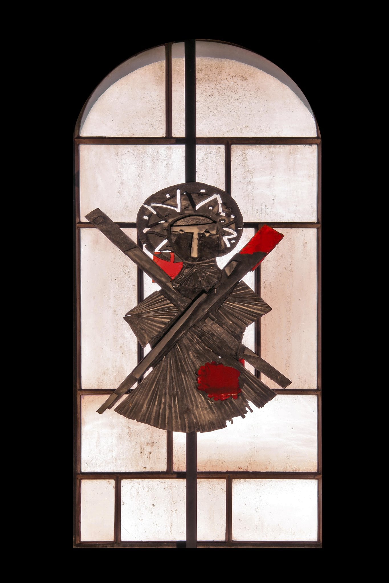 Saint André auréolé, posé sur un axe vertical métallique, tient sa croix devant lui. Trois morceaux en dalle de verre rouge et orange sont posés derrière le saint. Derrière, une fenêtre de verre blanc mis en plomb.