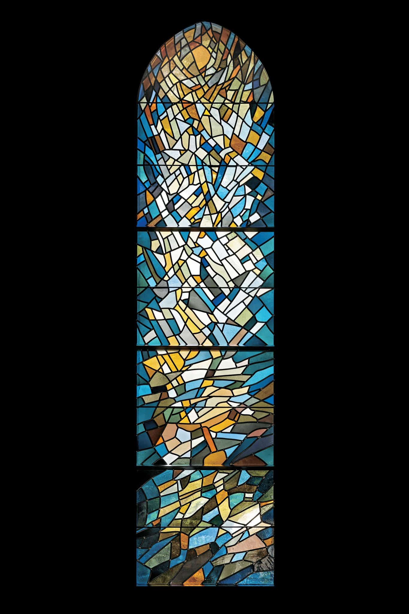 Vitrail non figuratif composé d’une multitude de petites pièces de verres aux tientes bleues, brunes, beiges, vertes et blanches.