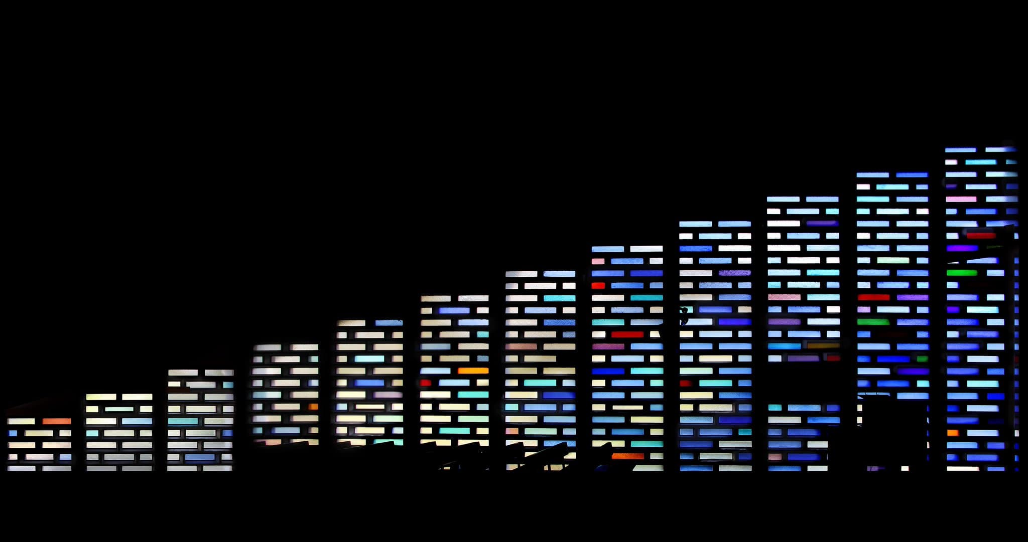 Paroi de verre de douze panneaux décroissants dans la hauteur, composés de claustras en béton à l’intérieur desquels il y a des verres doubles blancs, bleus, blanches, rouges, verts, oranges et mauves.
