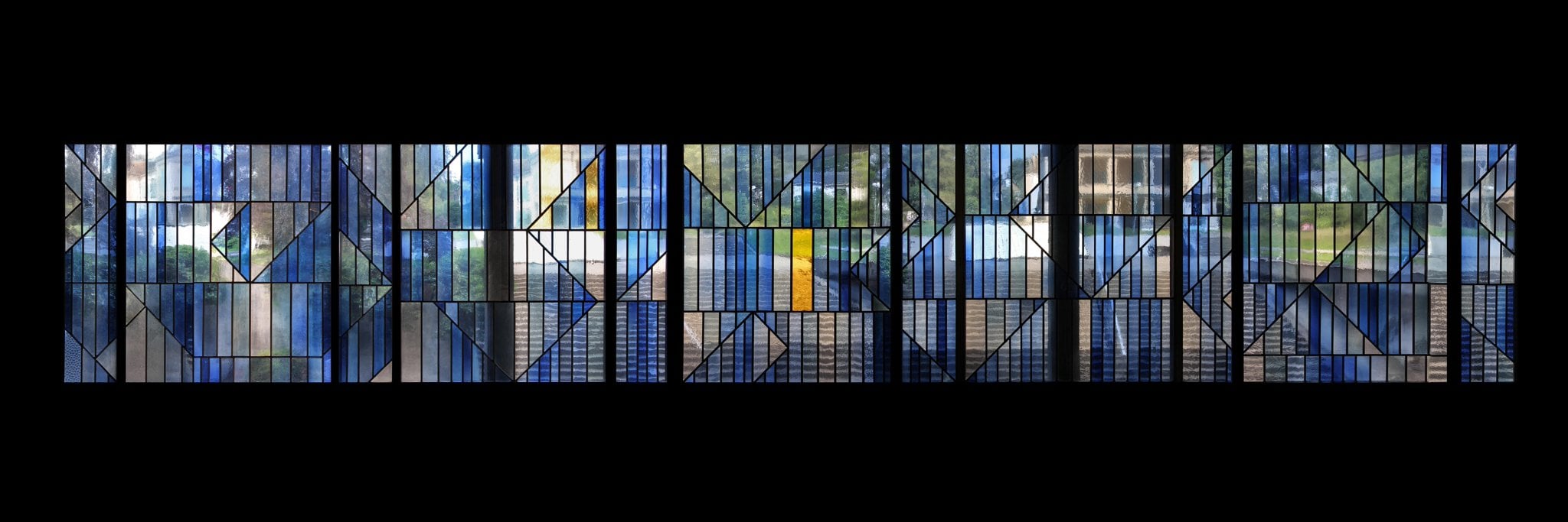 Une paroi verrière composée de douze panneaux de largeurs différentes aux teintes bleues, grises et blanches avec quelques taches jaunes.
