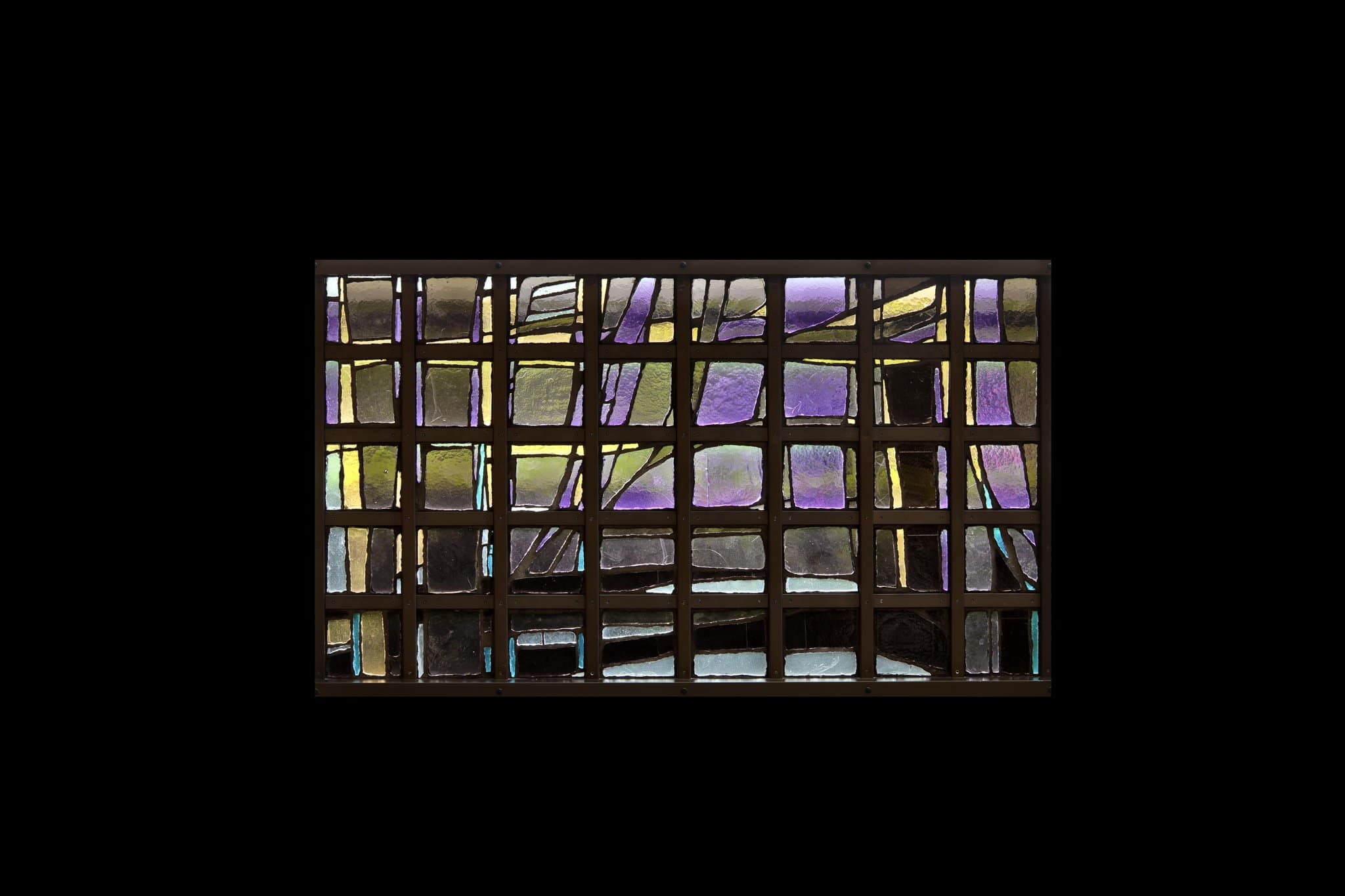 Vitrail non figuratif composé de lignes verticales et horizontales jaunes, violettes et bleus sur un fond gris. Un quadrillage en aluminium est apposé devant le panneau de verre.
