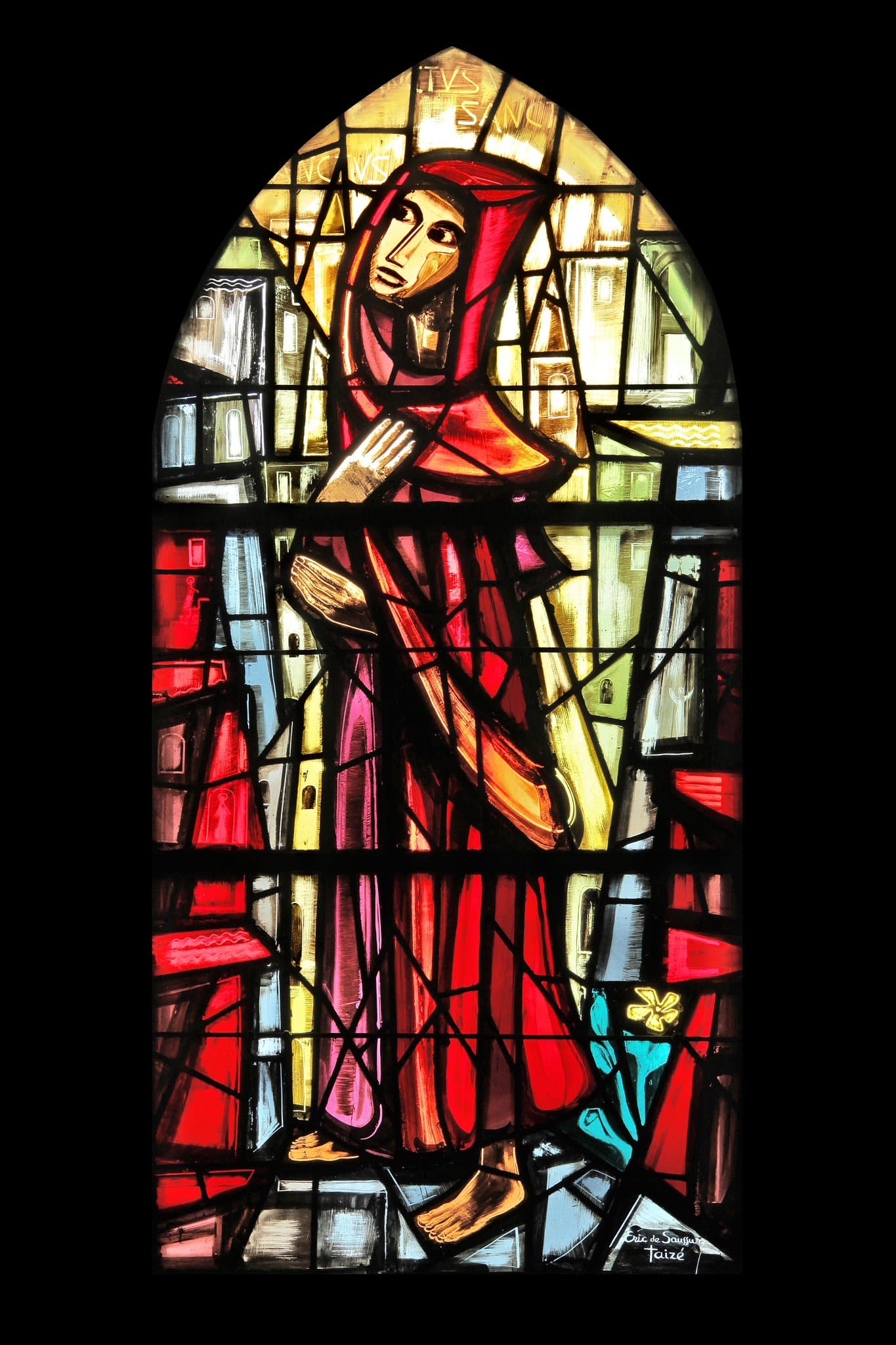 Isaïe, debout dans une robe à capuchon rouge devant une ville, entend les séraphins chanter le Sanctus. A ses pieds une fleur jaune.