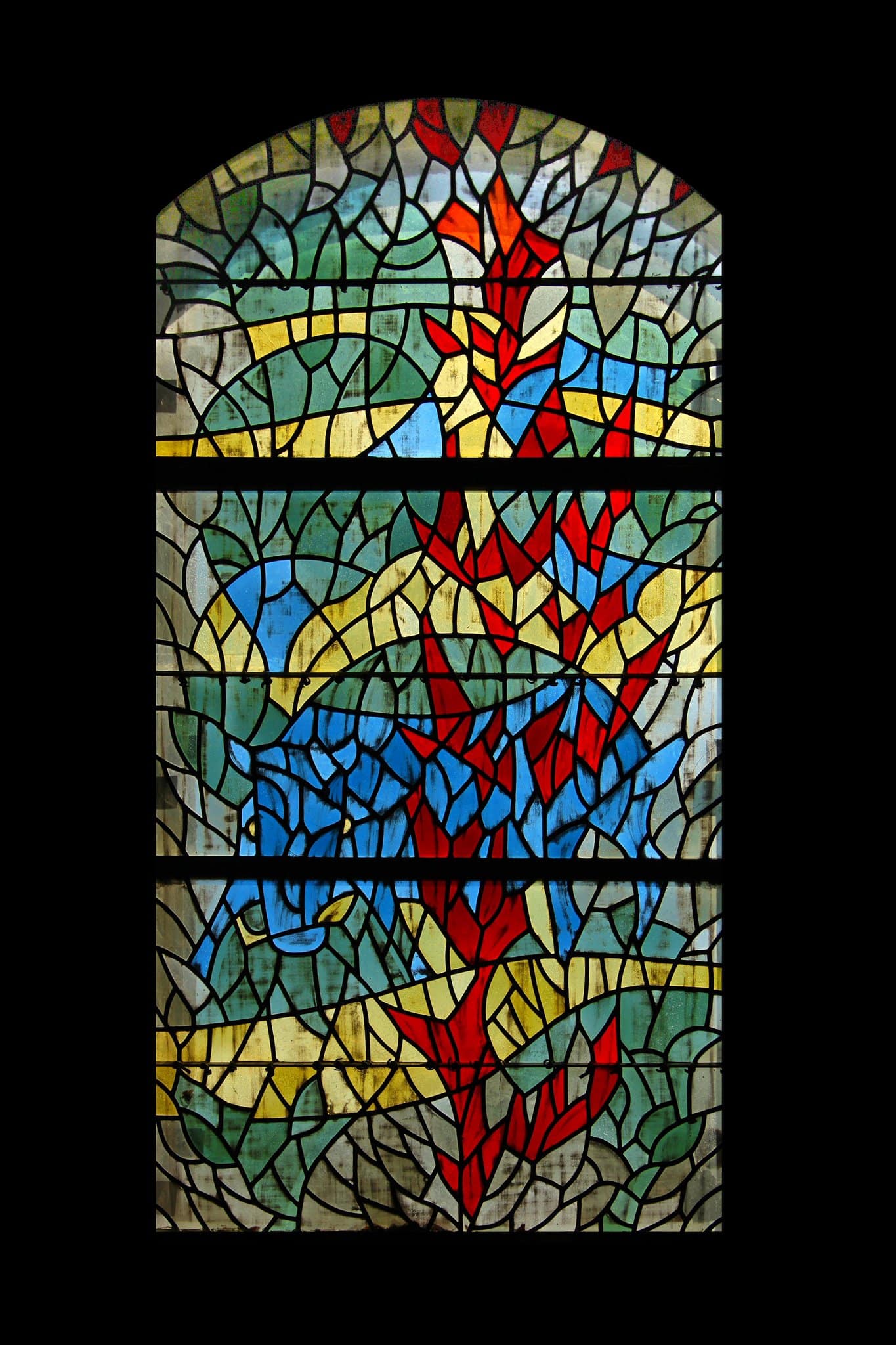 Un sanglier se trouve au milieu des vignes figurées sur plusieurs niveaux. Au premier plan, des flammes s’envolent vers le ciel.