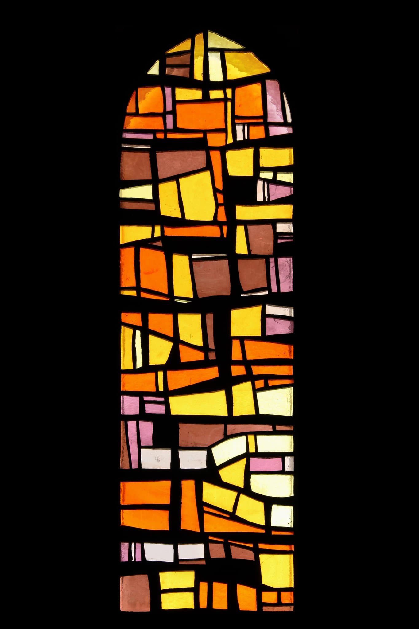 Vitrail non figuratif composé de verres aux couleurs chaudes (orange, jaune, brun).