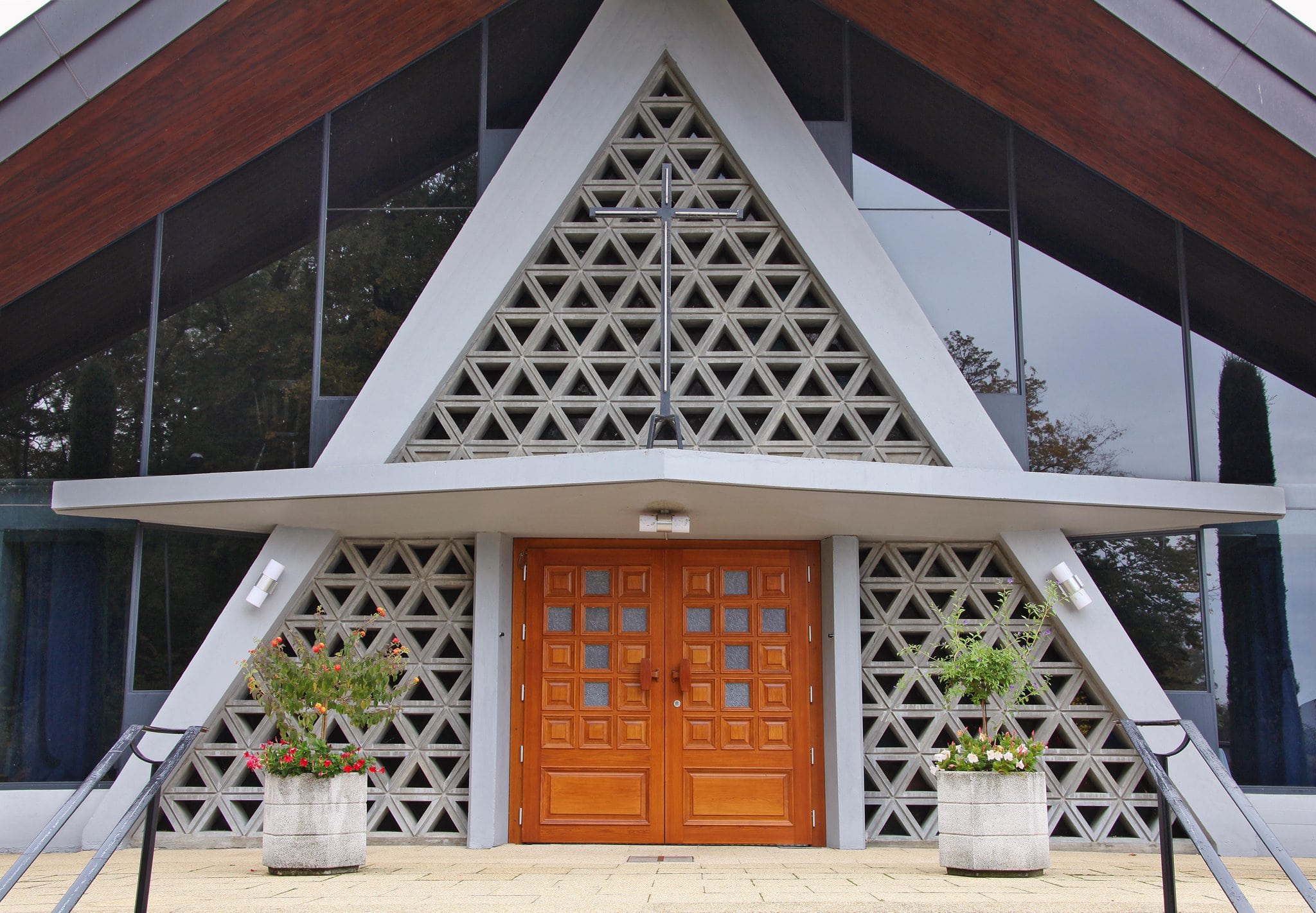 Un triangle monumental composé de trois panneaux entoure la porte d'entrée. Chacun d’eux est composé de verres triangulaires rouges, verts, jaunes inscrits dans des claustras en béton.