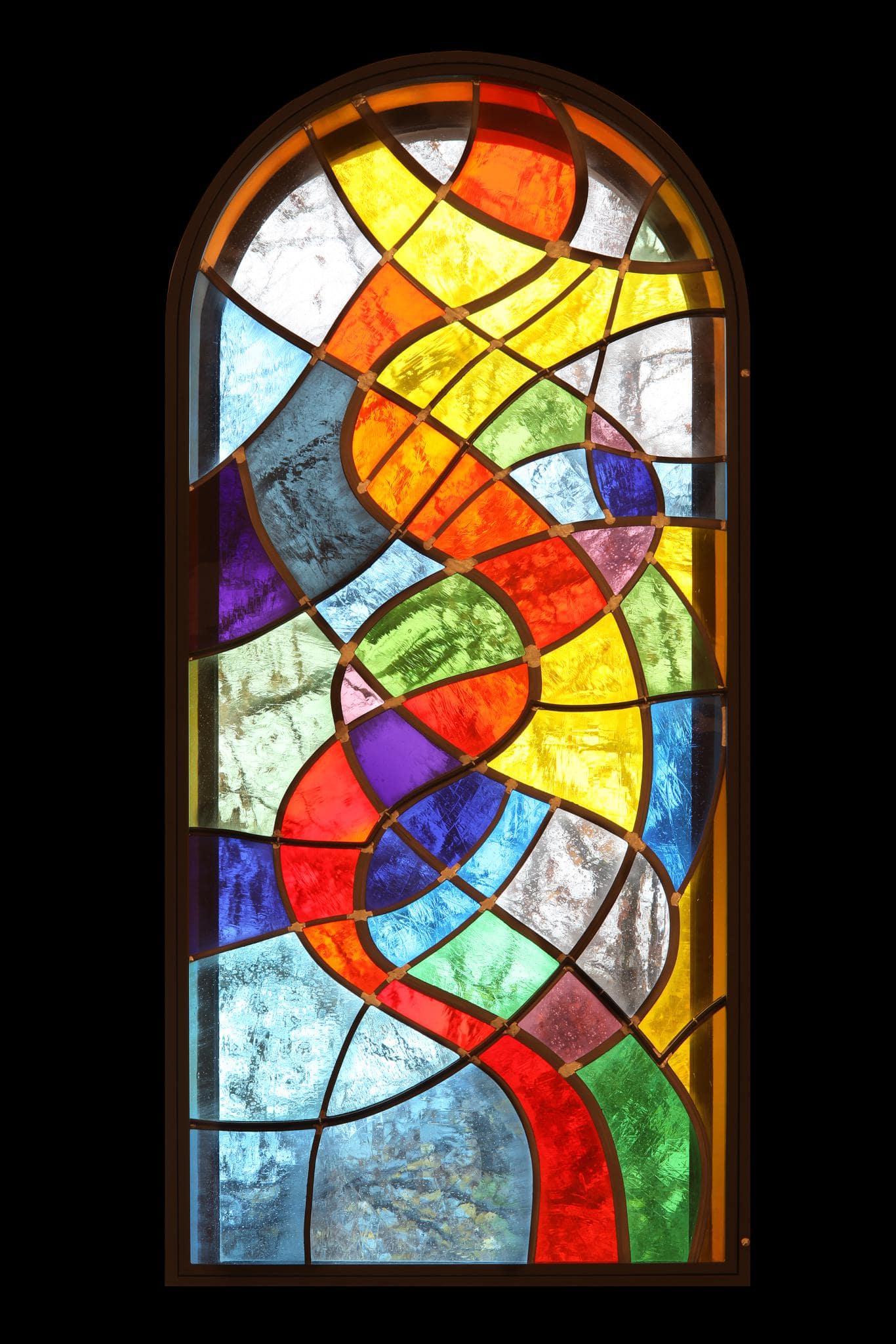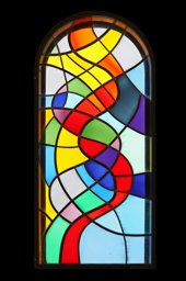 Vitrail abstrait composé de verres colorés rouges, oranges, jaunes, bleus, verts, gris, violets, roses et blancs symbolisant le peuple de Dieu, l’humanité et les membres de l’Eglise. Les lignes verticales et horizontales expriment à travers leurs ondulations un langage d’intense émotion : l’unification du peuple de Dieu créé à son image.