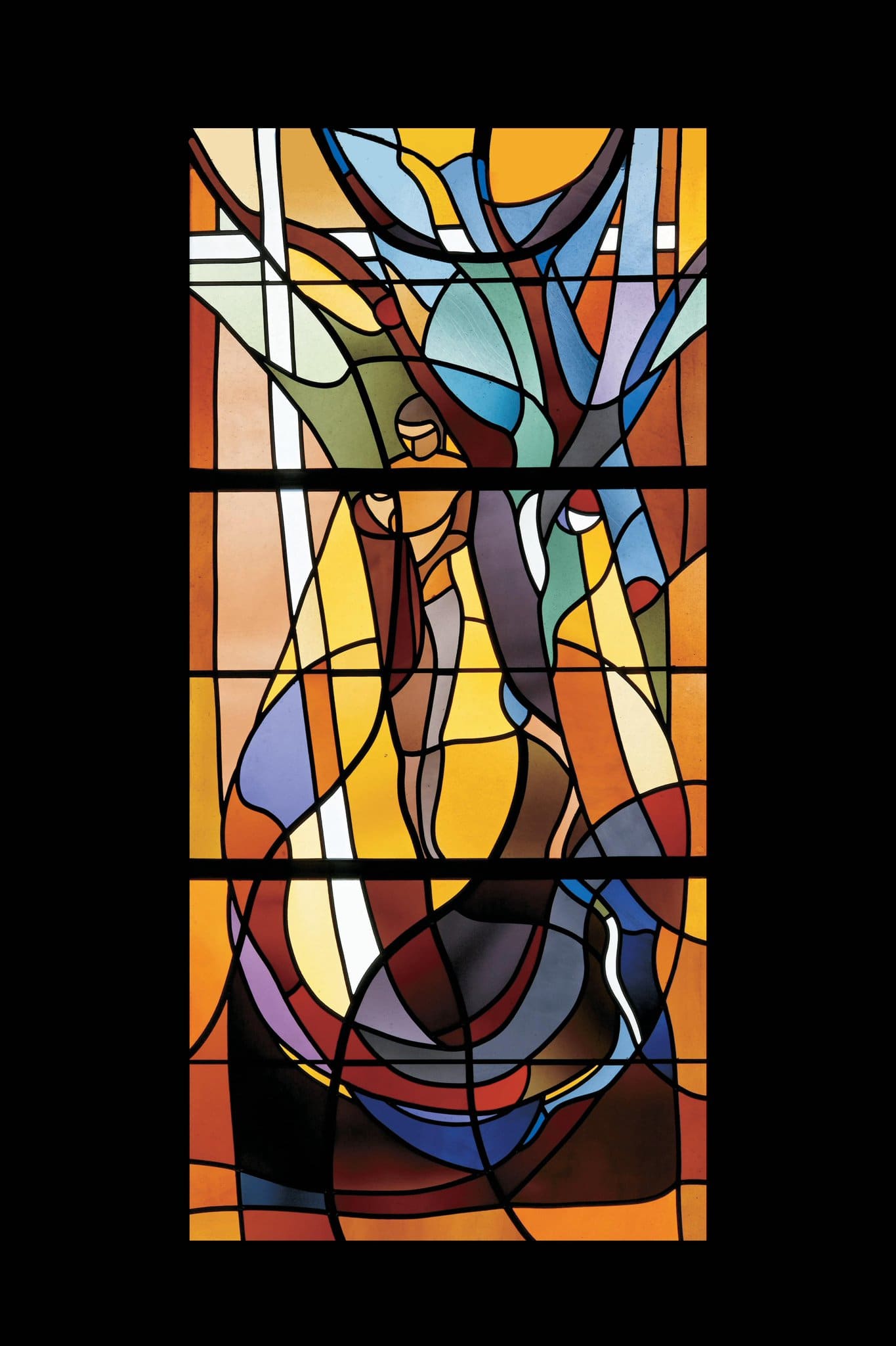 Ce vitrail relate le sixième jour de la Création du monde. Adam et Eve, figurés à la limite de l’abstraction et enracinés dans la sphère terrestre (celle du 1er jour), sont enlacés, alors que le serpent tentateur monte le long du tronc du pommier sortant des entrailles de la terre. A gauche se dresse une croix. Un liseré d’or encadre la scène.