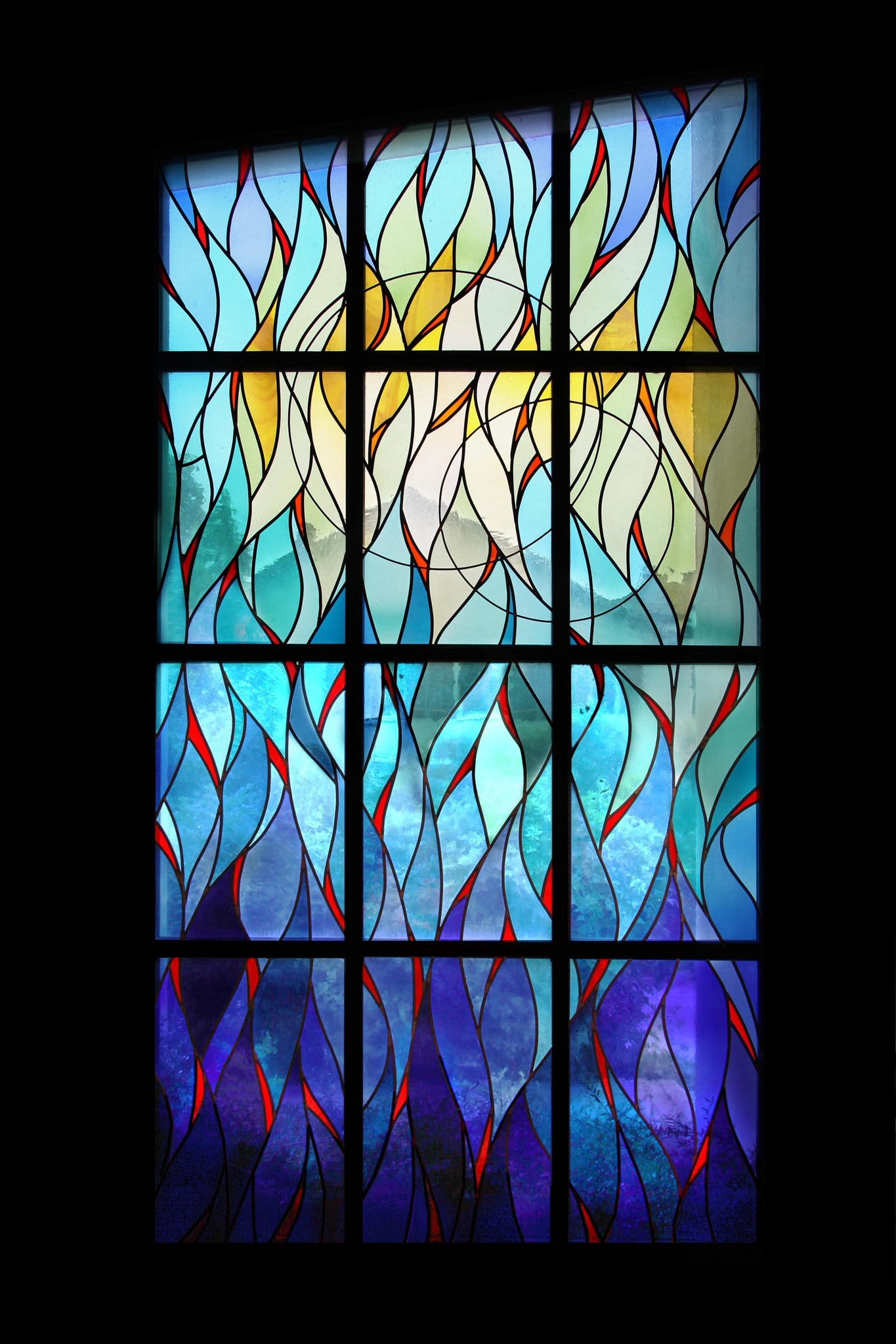 Le matin de la Résurrection suggéré par des teintes bleues et mauves selon un même dessin de flammes figuré sur le vitrail de la Vierge à l’Enfant. Deux cercles s’entrecroisant apparaissent sur un fond jaune pâle dans la partie supérieure, ils symbolisent la résurrection du Christ.