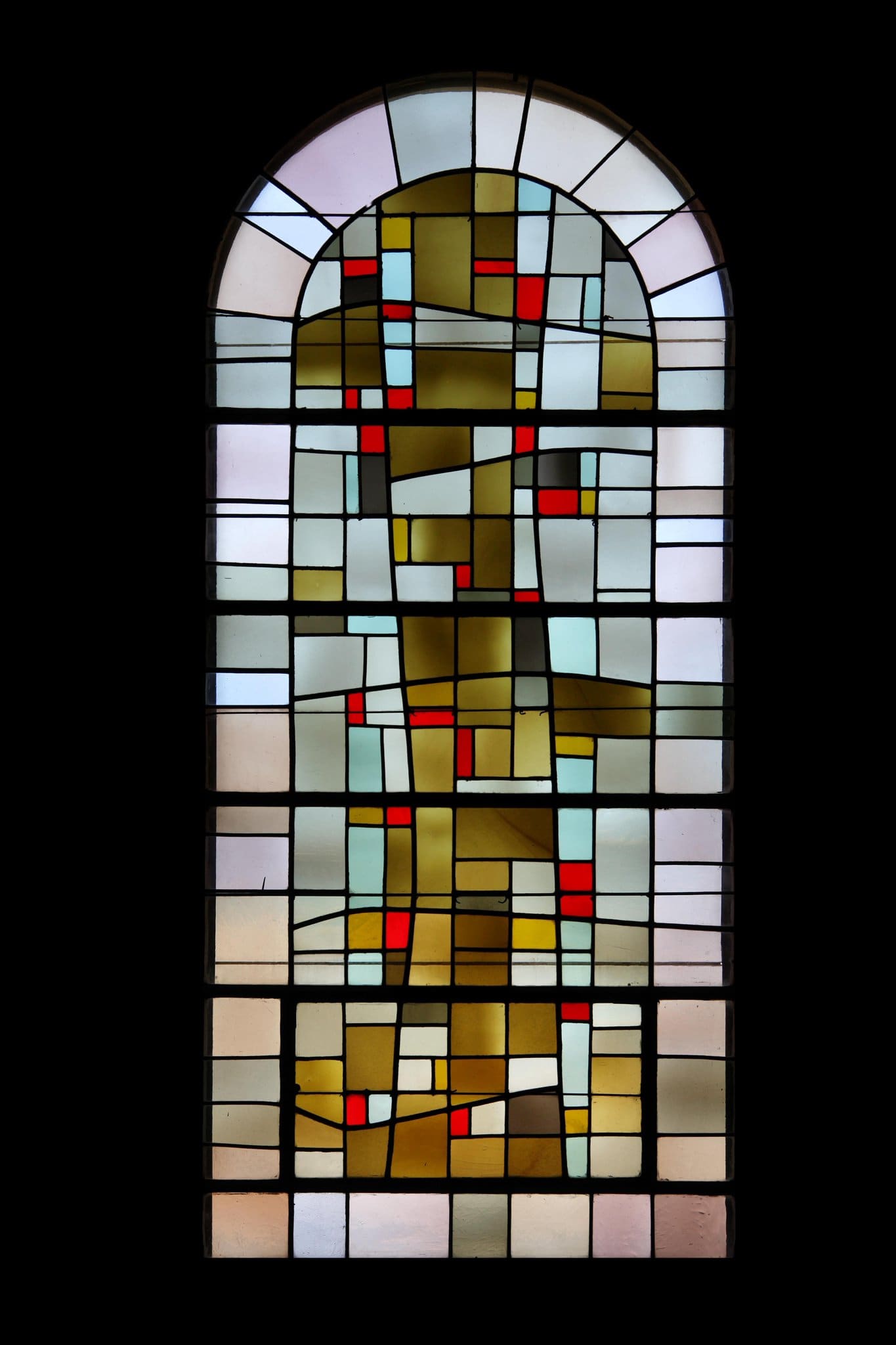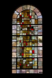 Vitrail composé de verres clairs avec au centre une dominante de tons bruns opposés à quelques touches rouges et jaunes.