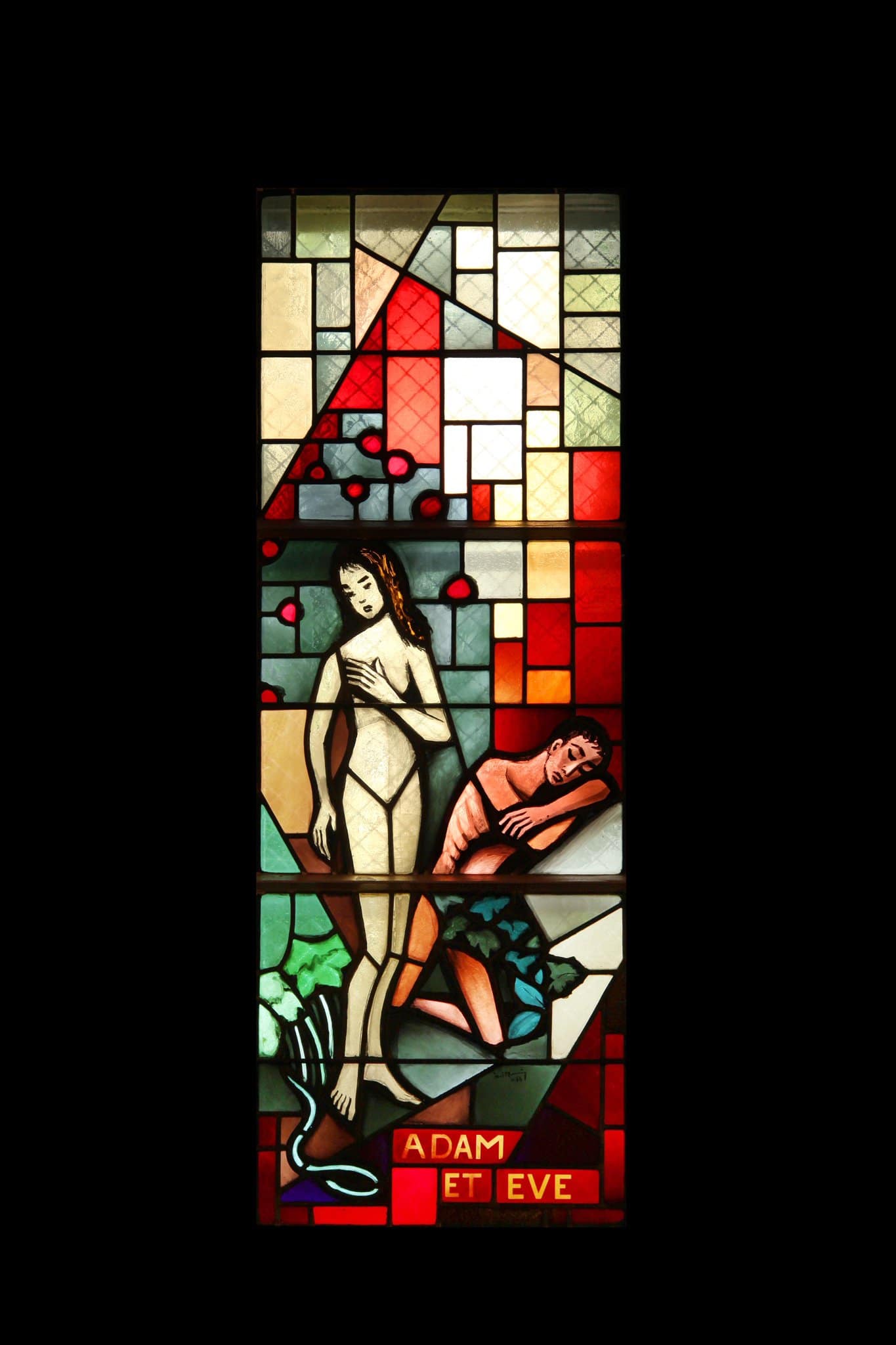 Adam dort appuyé contre un rocher alors qu’Eve est deboutà côté. A ses pieds, le serpent et des arbres.