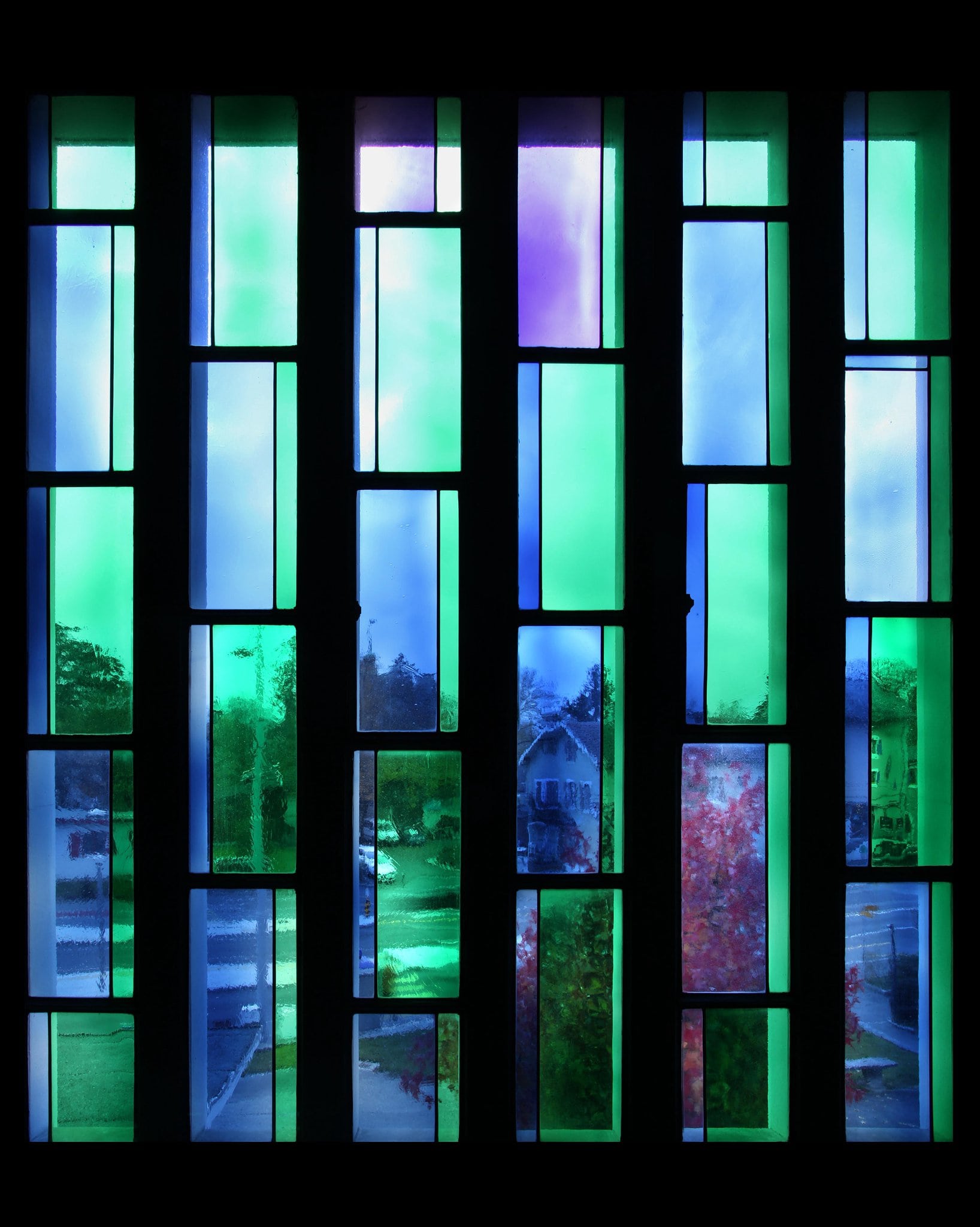 Vitrail non figuratif composé de six panneaux aux teintes bleues, vertes et blanches.