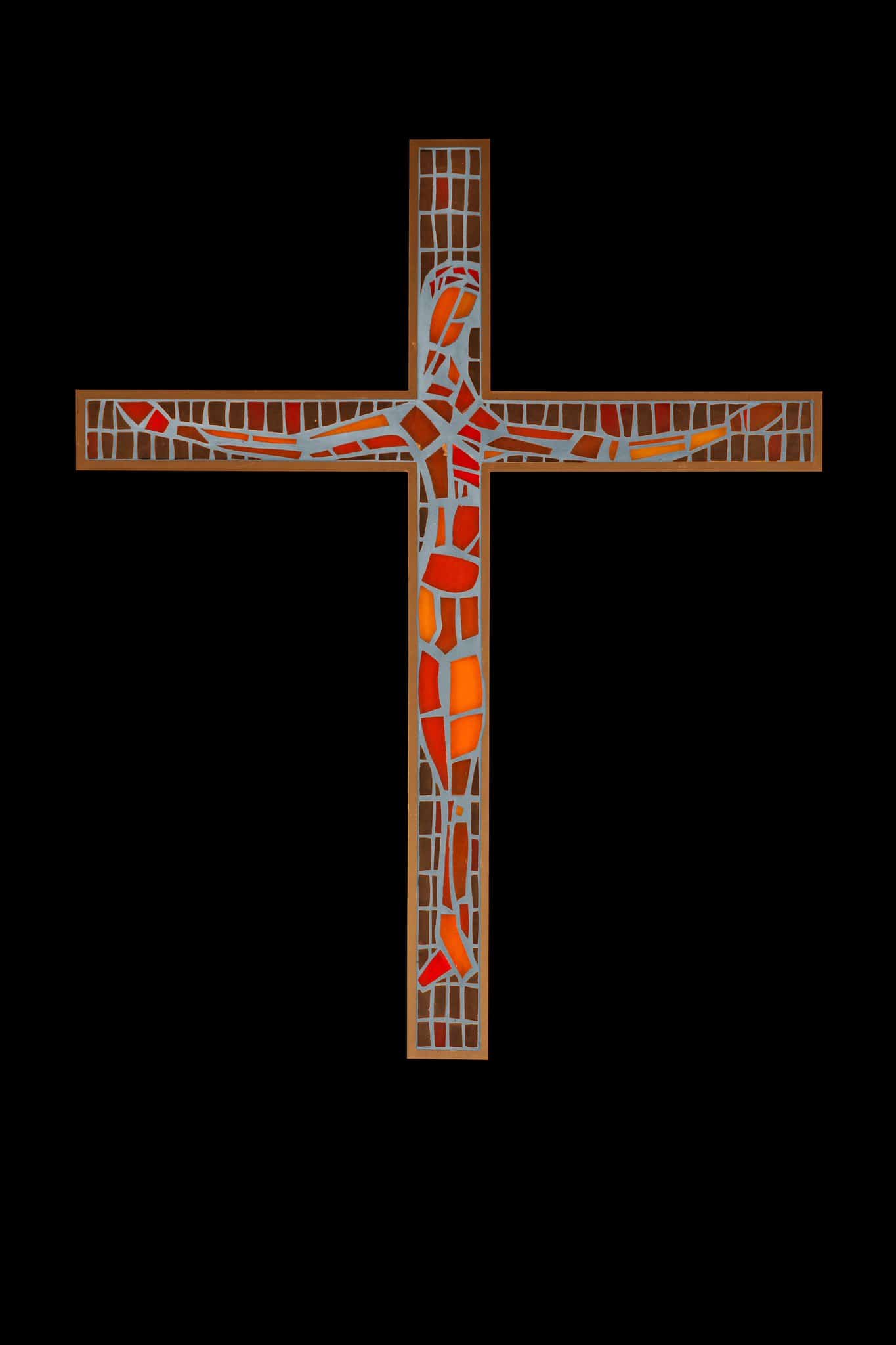 Le Christ crucifié sur la croix dans des teintes oranges et brunes.