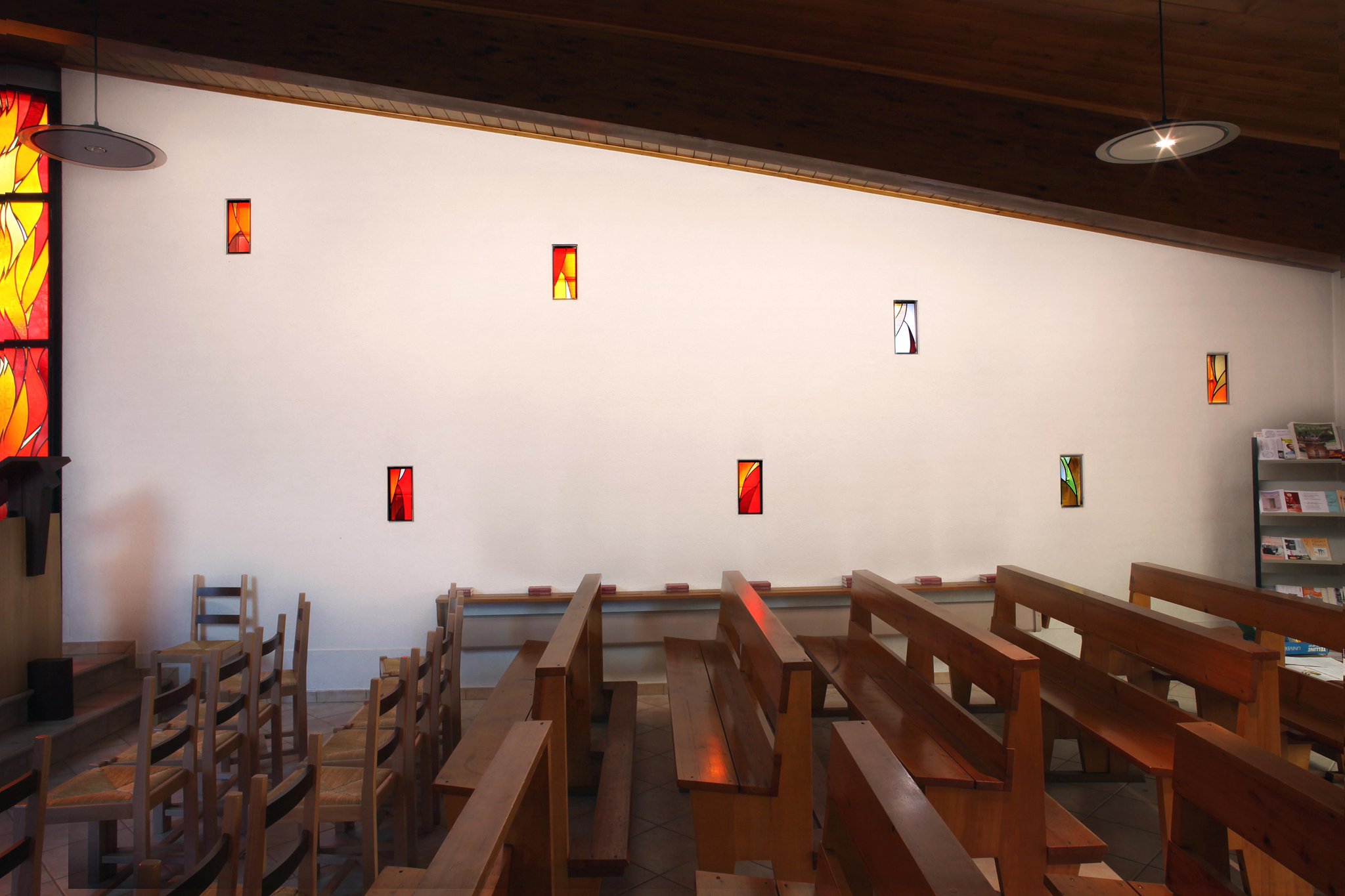 Sept petites ouvertures dans les teintes rouge, orange et jaune symbolisant les sept premières stations du Chemin de croix: condamnation de Jésus à être crucifié, Jésus chargé de sa croix, première chute de Jésus sous le poids de sa croix, Jésus rencontrant Marie, Simon de Cyrène aidant Jésus à porter sa croix, sainte Véronique essuyant le visage de Jésus et Jésus tombant pour la seconde fois.
