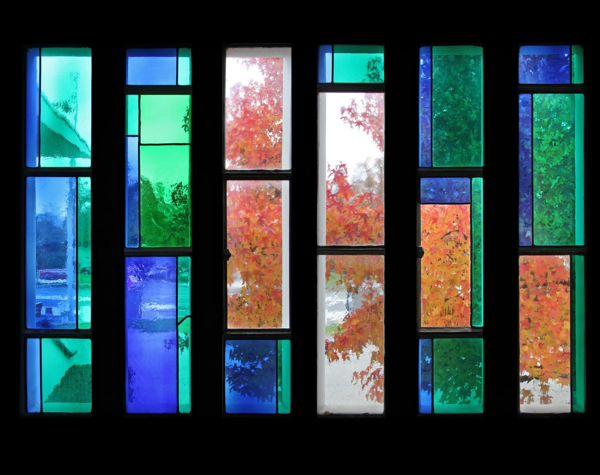 Vitrail non figuratif composé de six panneaux aux teintes bleues, vertes et blanches.
