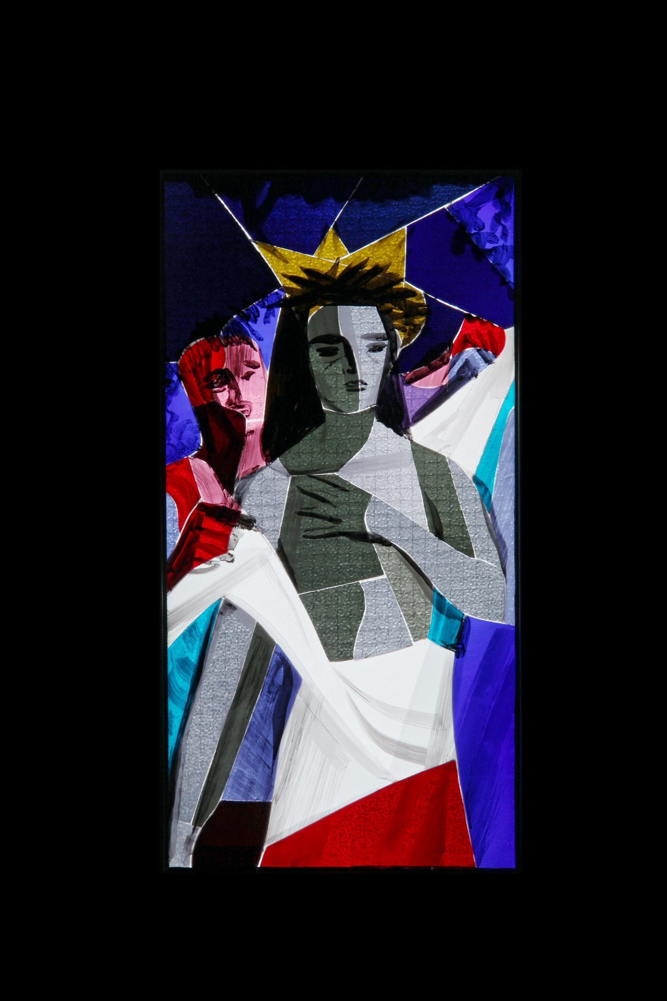 En avril 1954, les grands vitraux à losanges sont presque tous posés, adoucissant non seulement l’atmosphère de l’église mais semblant aussi agrandir l’espace intérieur. En octobre, Chavaz vient poser deux stations du chemin de croix à titre d’essai pour vérifier que les teintes choisies se marient avec les verrières de Dunand et le reste de l’église (Bulletin paroissial, 1954a et b). La paroisse manquant d’une grande part du budget pour ces oeuvres, elle ne peut commander fermement les verrières à l’artiste. Elle lui demande néanmoins de dessiner les cartons et l’assure que c’est lui qui les réalisera (Chamay, 1955a et b). Chavaz propose de faire d’autres essais. Pour équilibrer l’ensemble, il souhaite réaliser les quatorze stations simultanément (Chavaz, 1955). La paroisse reçoit une subvention de la Fondation Gleyre, à la condition de pouvoir se faire un avis sur la qualité des œuvres graphiques de l’artiste (Chamay, 1956). En décembre 1956, Chavaz et Herbert Fleckner viennent donc apporter les maquettes à la paroisse et poser quatre verrières pour contrôler les teintes in situ (Chavaz, 1956). L’ensemble des vitraux est posé en mai 1957 (Chamay, 1957). Sur le conseil de Chavaz, quelques pièces de verre des fenêtres à losanges apportant une lumière trop vive sont assombries avec une couleur opaque (Chavaz, 1957).