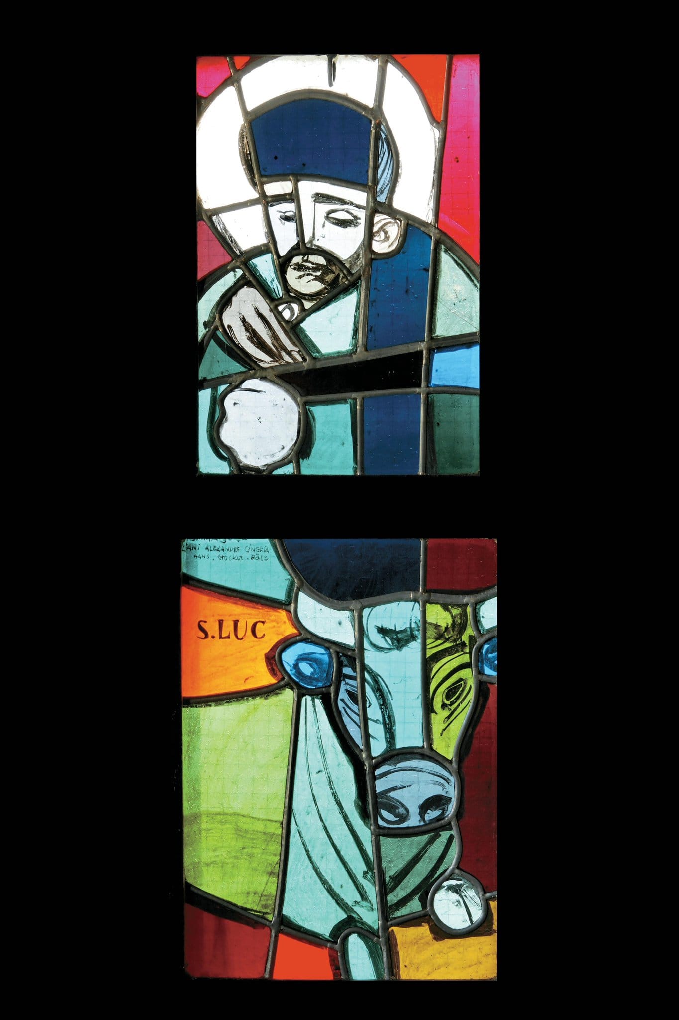 Petit vitrail composé de deux panneaux avec en haut saint Luc et en bas un taureau couché.