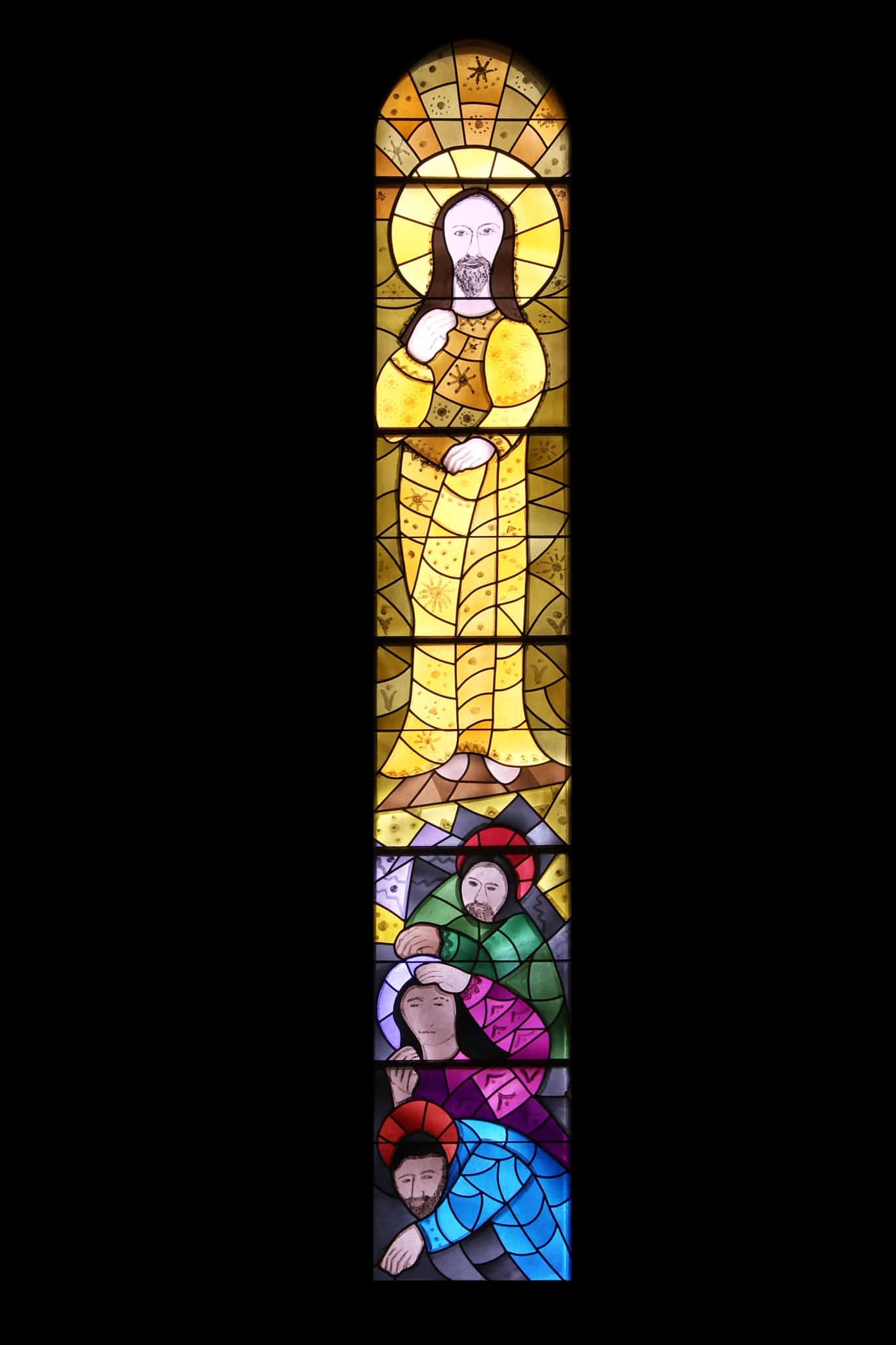 Le Christ transfiguré est présenté de face. A ses pieds, les apôtres Pierre et Jacques ferment les yeux tout en se protégeant de la lumière alors que Jean a gardé les yeux ouverts.