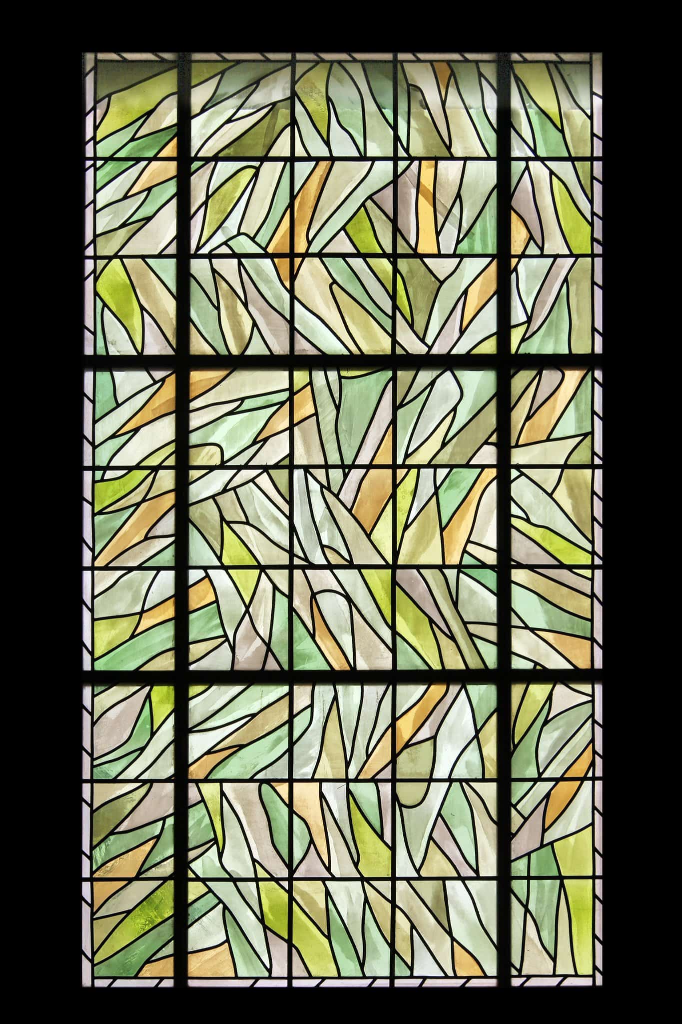 Vitrail non figuratif composé de verres verts, beiges et blancs et entouré d’une fine bordure blanche.