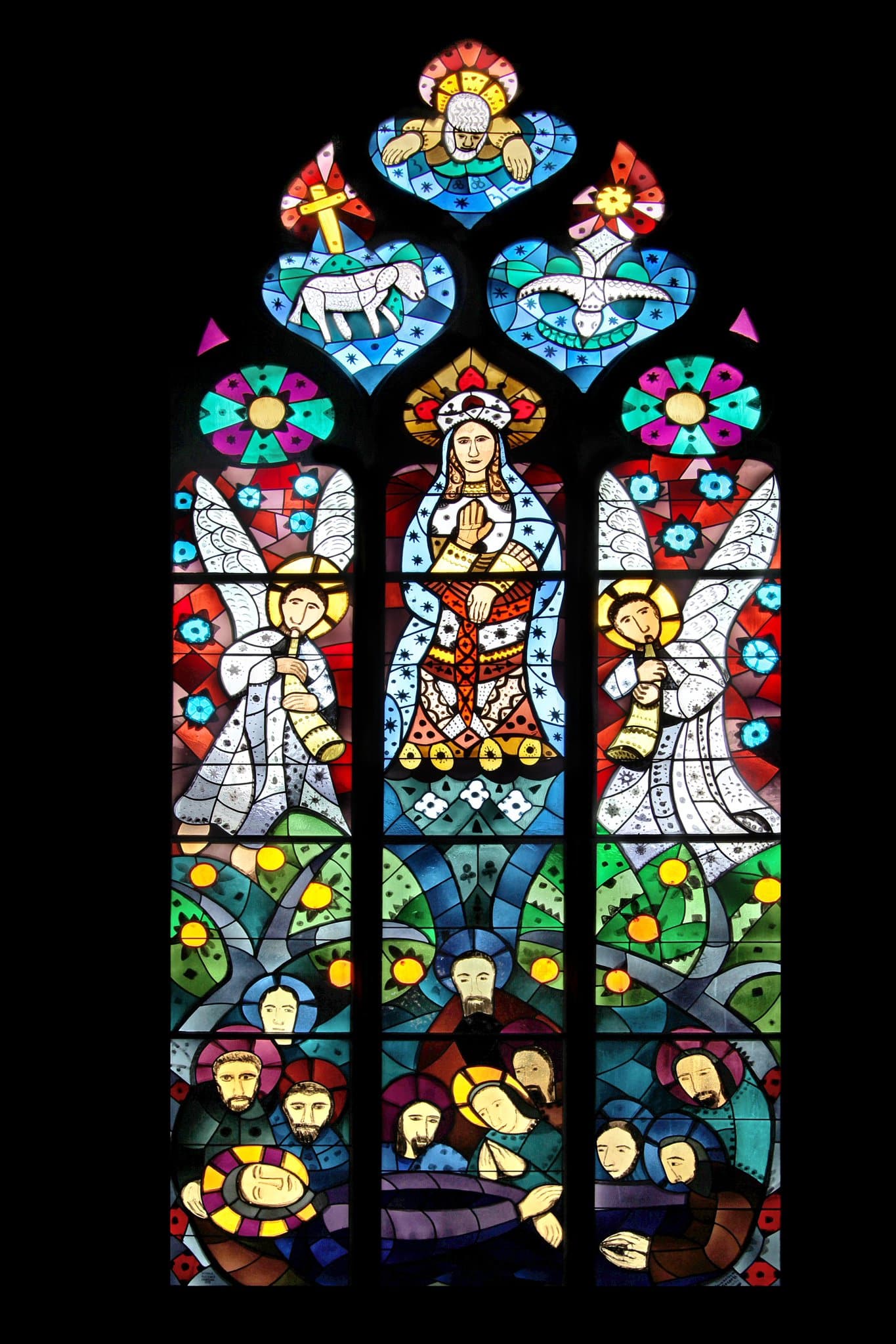 En haut, la Vierge, coiffée d’une couronne byzantine et vêtue d’un manteau constellé d’étoiles, est entouré de deux anges jouant de la trompette. En bas, le corps de la Vierge , les mains croisées est présenté sur un lit. Dix apôtres l’entourent en prière (en bas). Les symboles de la Trinité (Dieu le père, la croix, l’agneau et la colombe du Saint-Esprit) figurent dans les remplages.