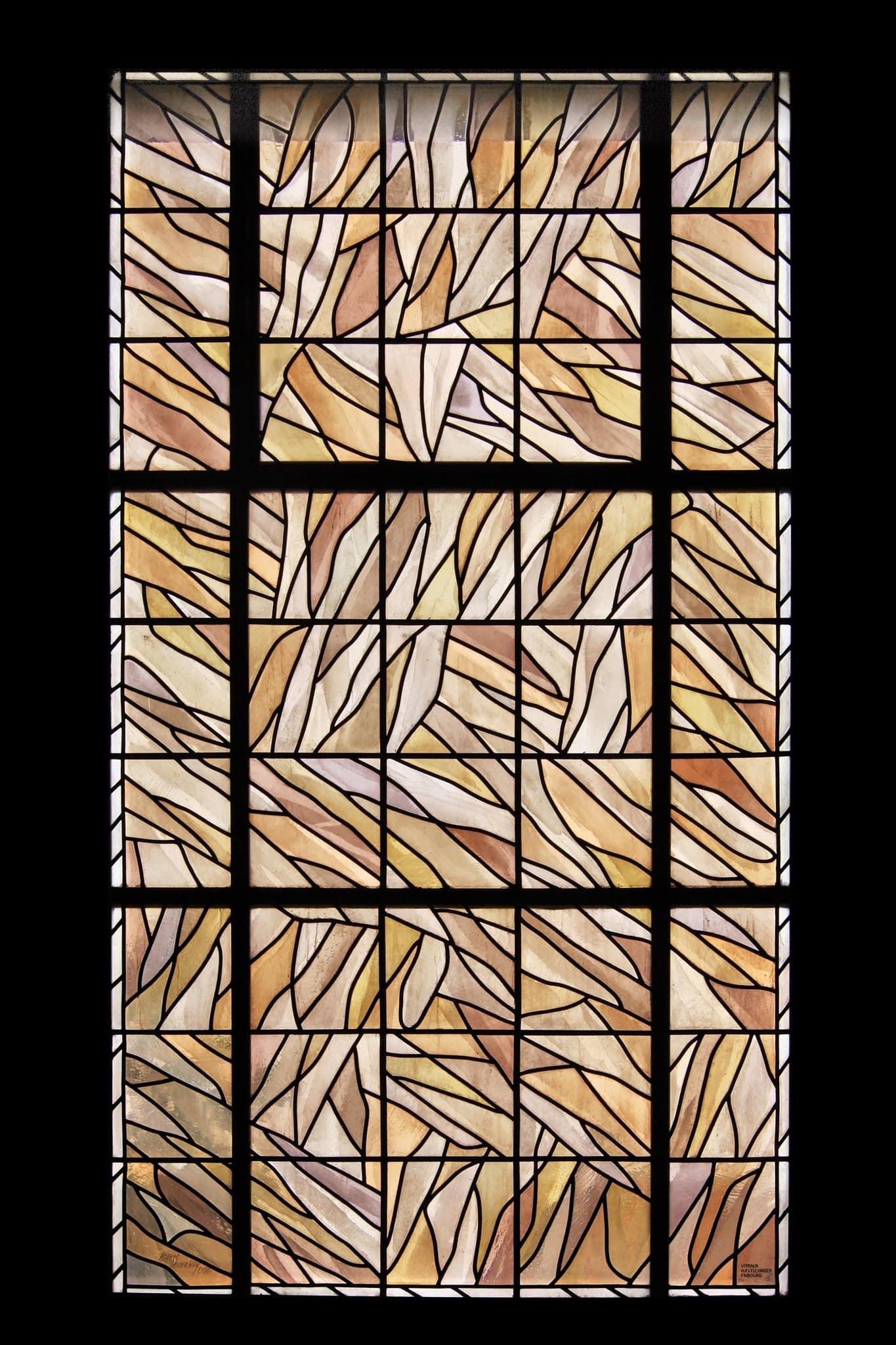 Vitrail non figuratif composé de verres roses, bruns et beiges et entouré d’une fine bordure blanche.