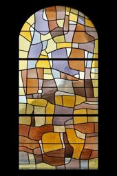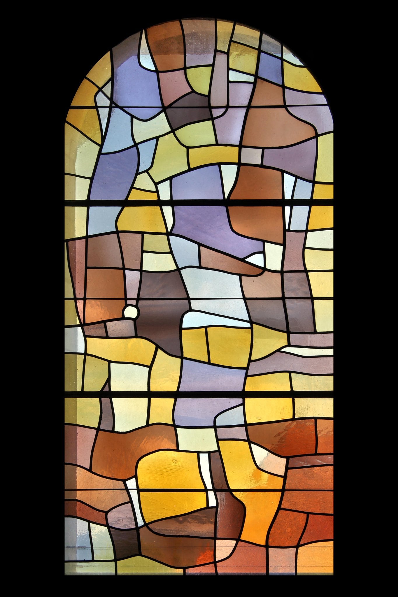 Vitrail non figuratif composé de verres beiges, bruns, jaunes et mauves.