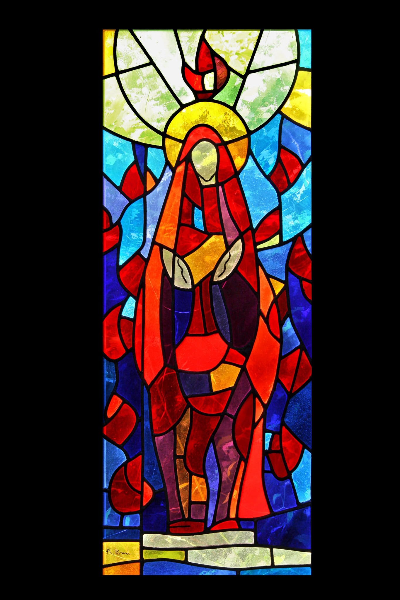 La Vierge debout reçoit l’Esprit Saint descendant du ciel sous la forme de langues de feu.