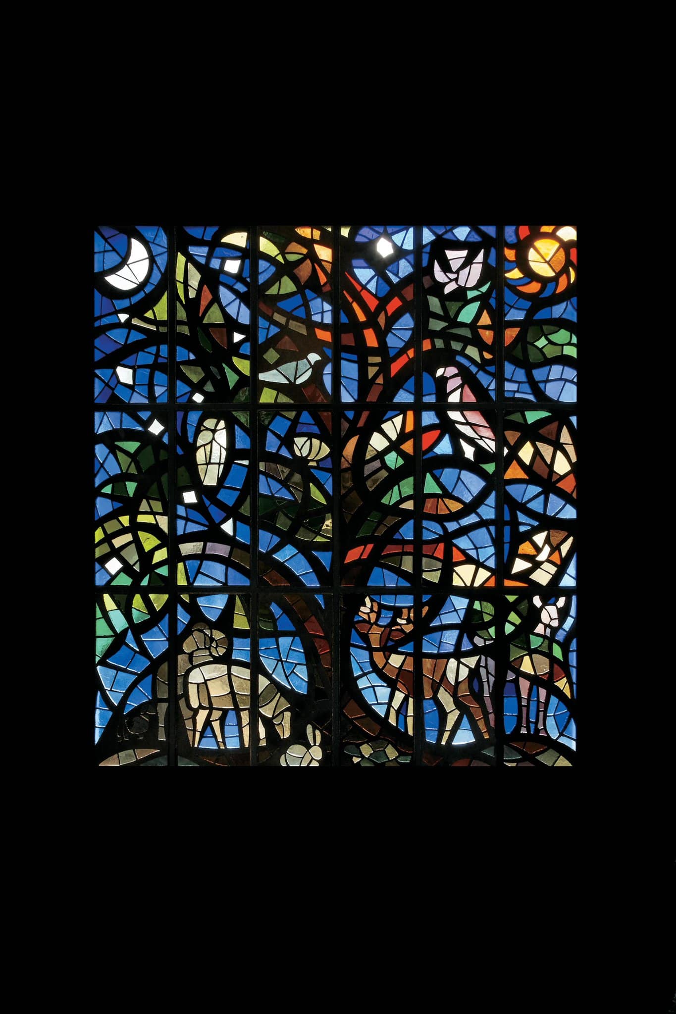 Un bélier, un mouton, un lapin, une tortue, un cerf, une biche ainsi que des hiboux, un faucon et une tourterelle posés dans un arbre s’animent sous le regard de la lune et du soleil.