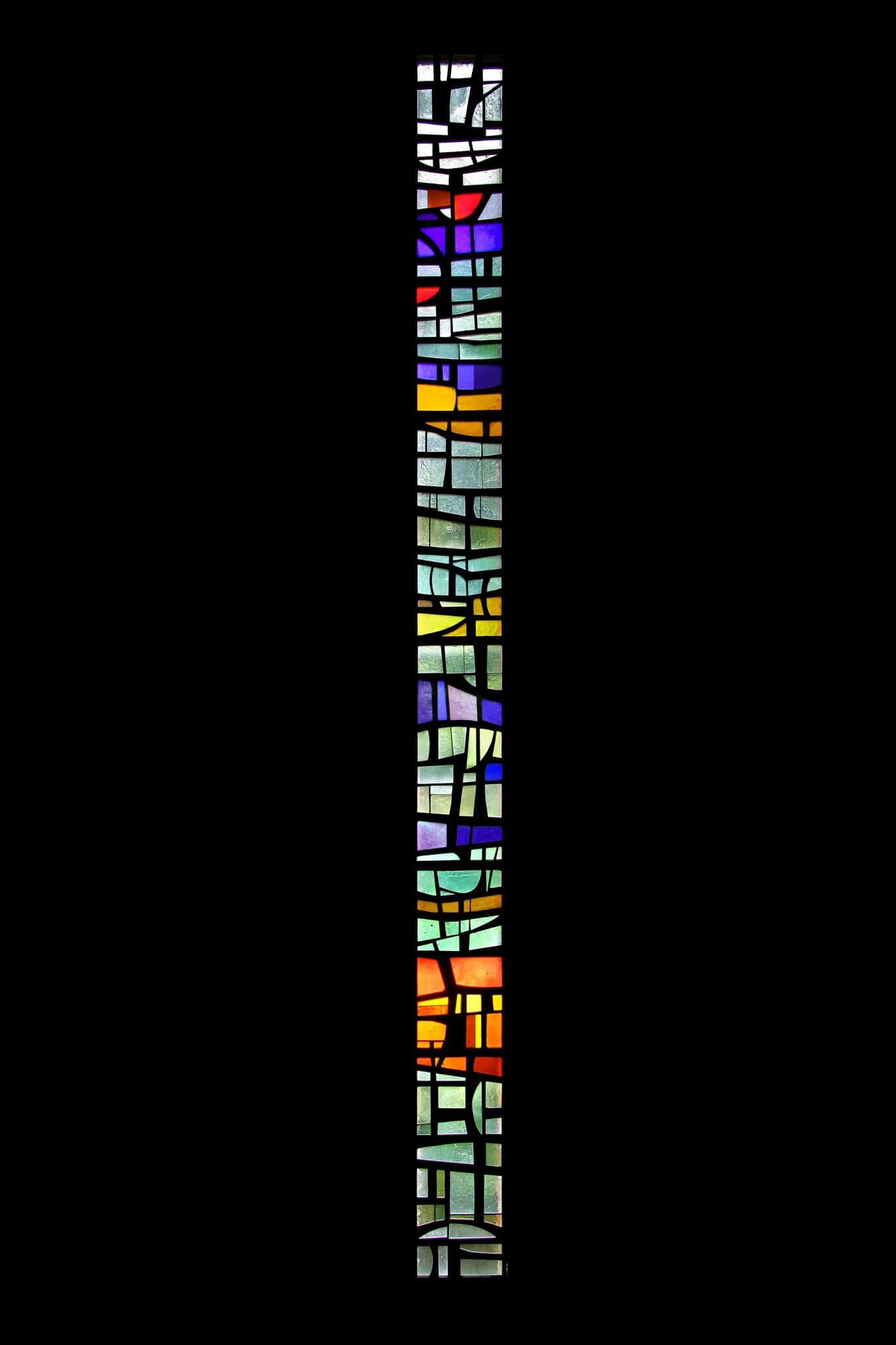 Vitrail non figuratif composé de teintes blanches, bleues, jaunes, oranges, rouges et violettes.