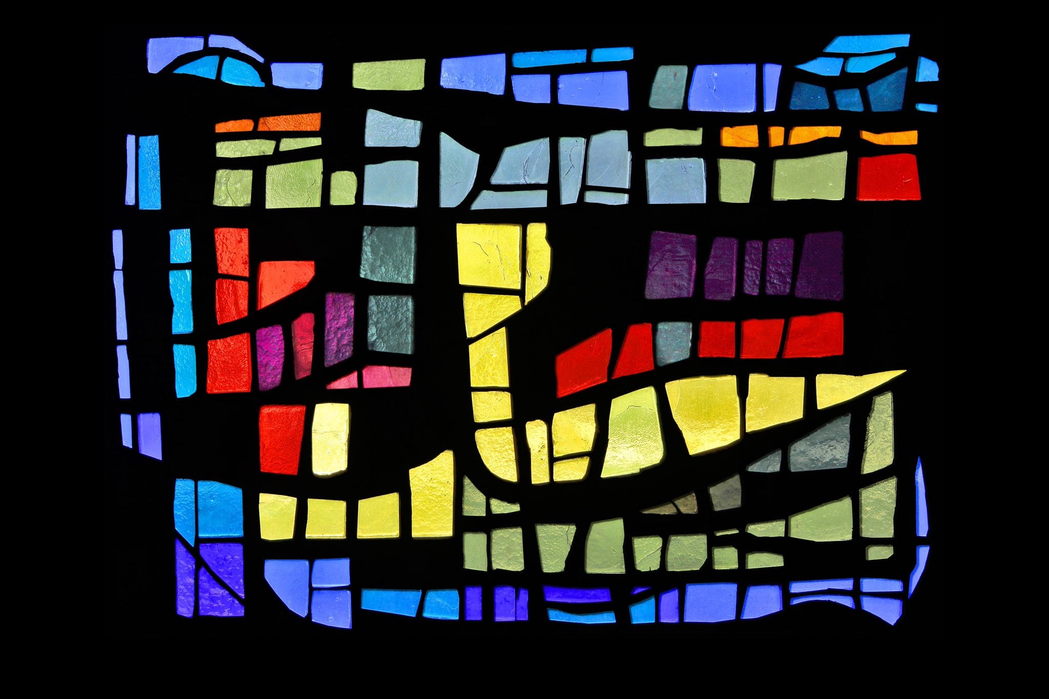 Dalle de verre non figurative composée de verres aux teintes bleues, grises, jaunes, rouges, oranges et violettes. Le béton compose un dessin aux lignes variées.