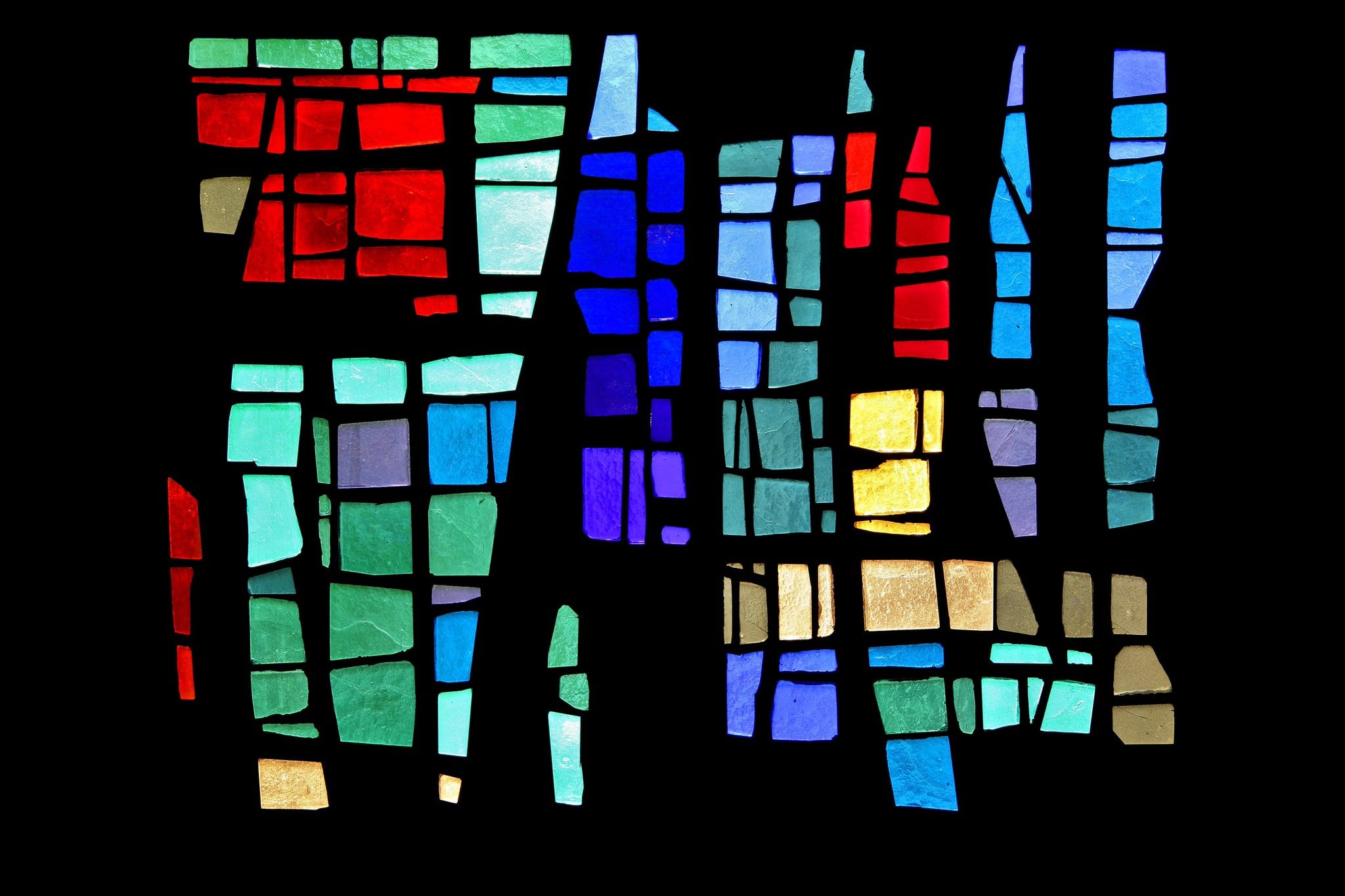 Dalle de verre non figurative composée de verres aux teintes bleues, vertes, rouges, oranges, jaunes et beiges. Le béton compose un dessin aux lignes variées.