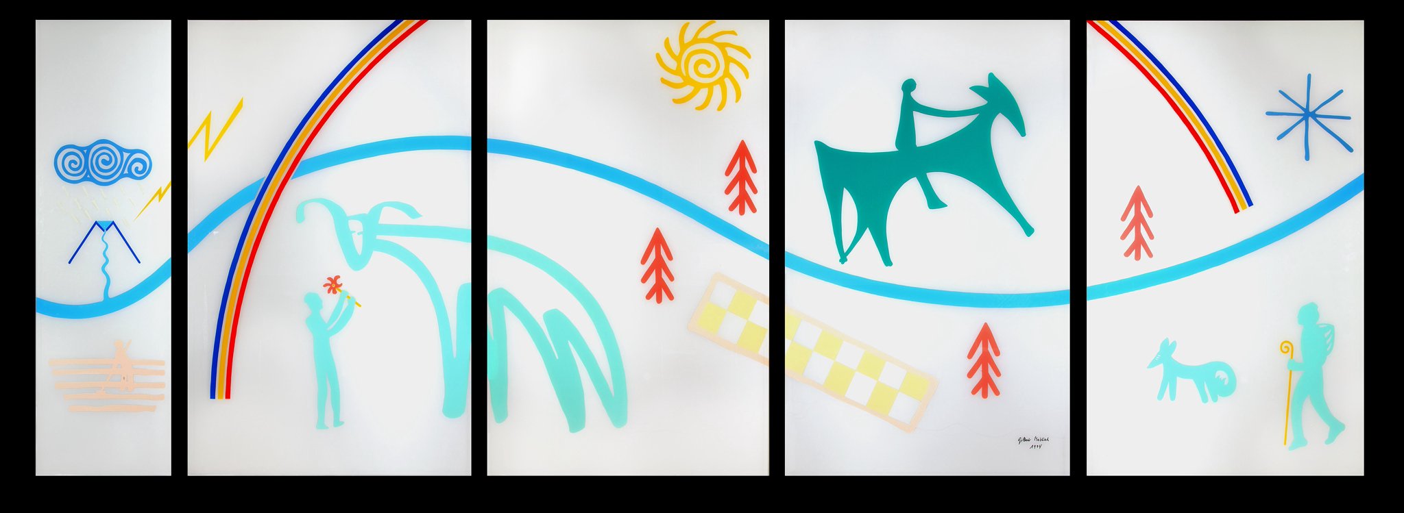 Au centre de la composition de ce paravent, un grand arc-en-ciel domine un paysage rupestre traversé par une rivière et animé d’un homme nourrissant une chèvre, d’un cavalier sur sa monture et d’un marcheur avec son chien.
