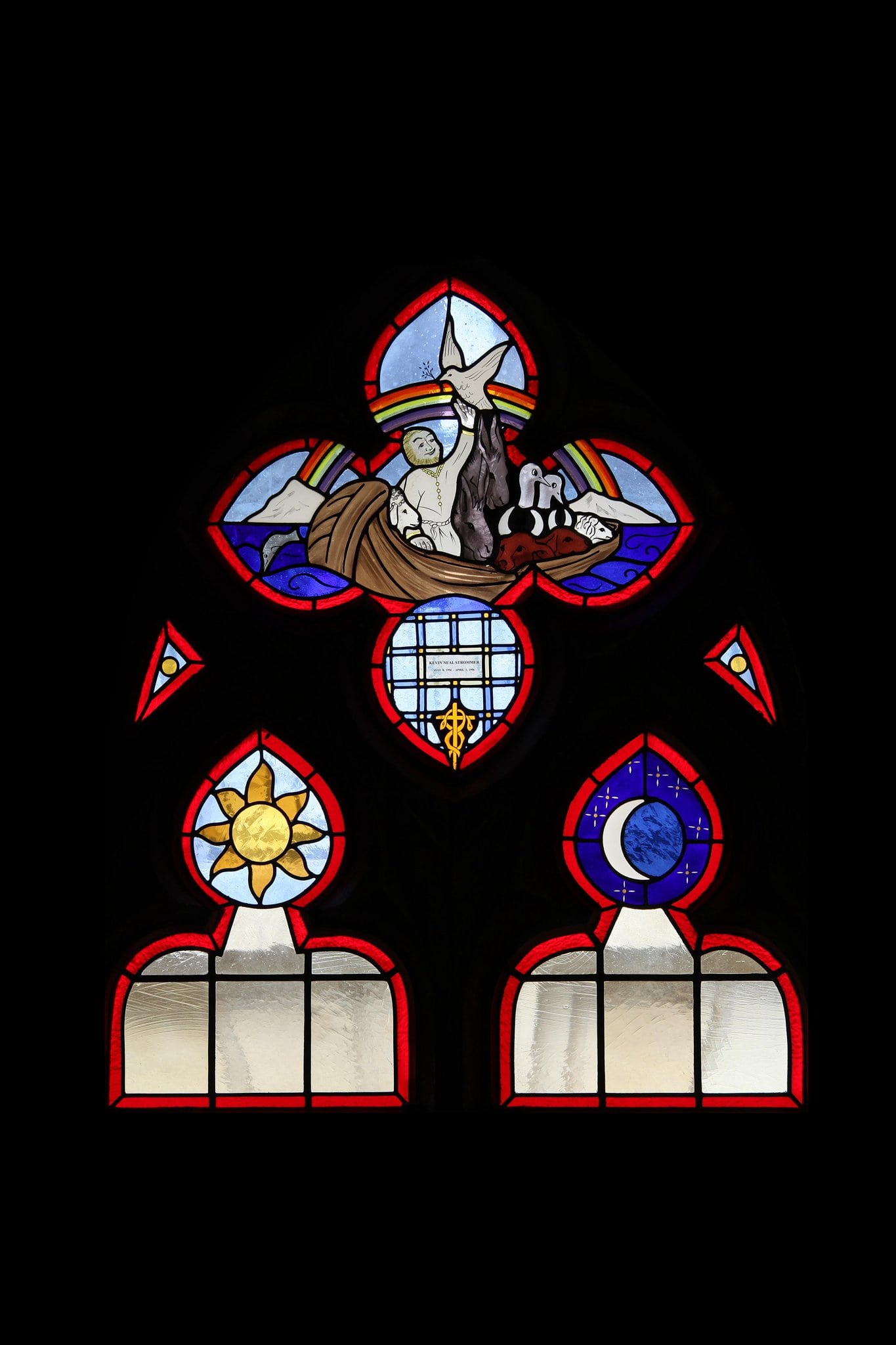 Noé se tient debout dans l’arche entouré de deux moutons, deux ânes, deux boeufs et des oiseaux. Il lève un bras et accueille la colombe qui revient avec un rameau d’olivier tout frais. Derrière l’arc-en-ciel. En-dessous du quadrilobe, le soleil et la lune.