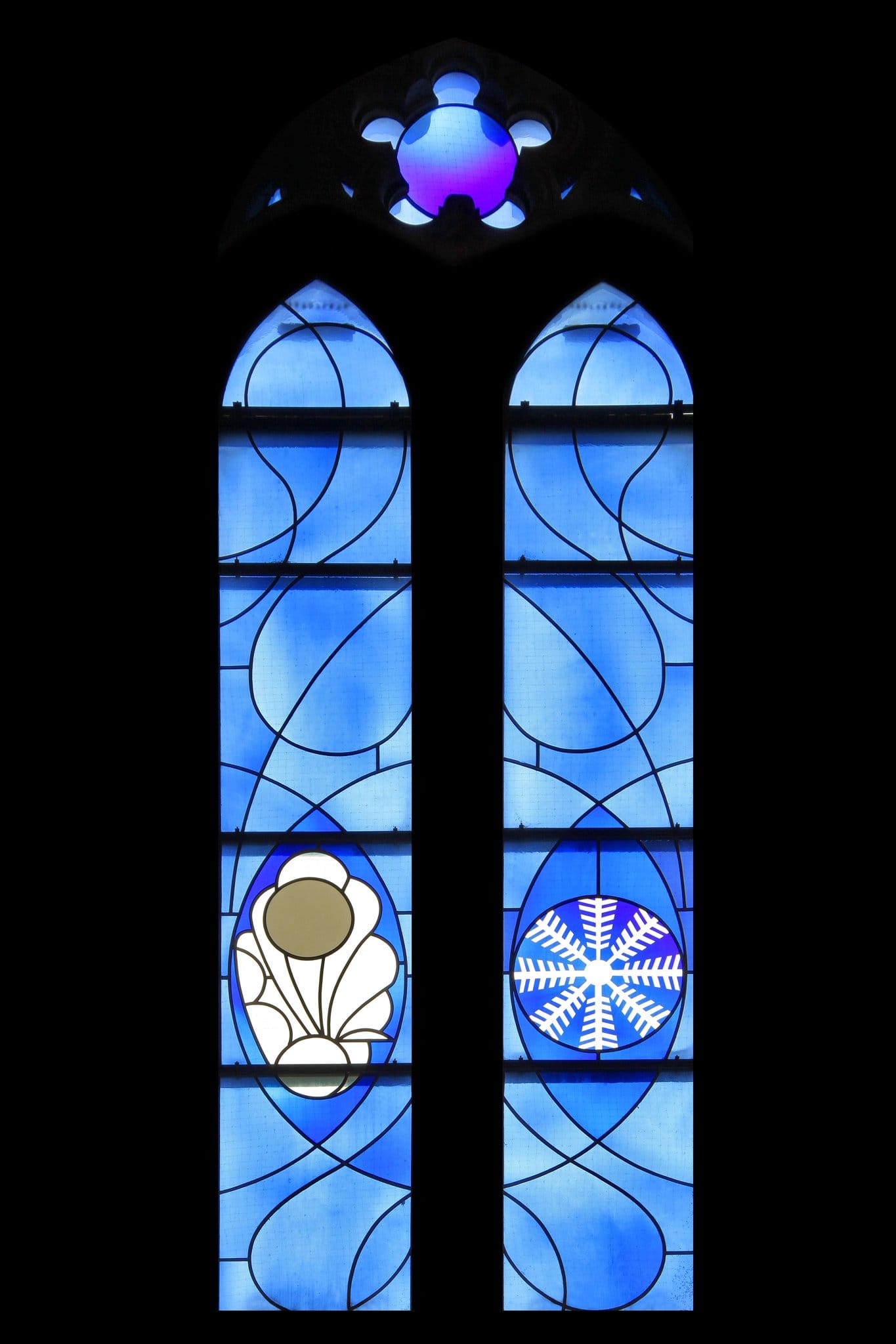 Perle précieuse, priez pour nous (lancette de gauche). Cause de notre joie, priez pour nous (lancette de droite). Le tout sur un fond bleu avec des courbes dessinées par les plombs.