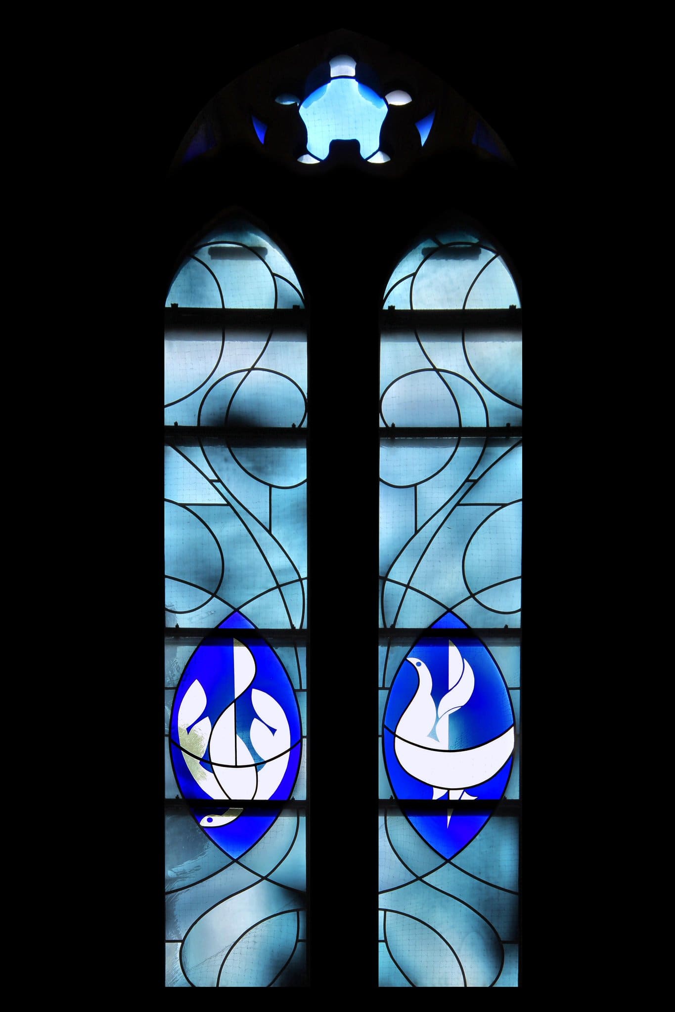 Marie annonciatrice de paix, priez pour nous (lancette de gauche). Vierge fidèle, priez pour nous (lancette de droite). Le tout sur un fond bleu avec des courbes dessinées par les plombs.