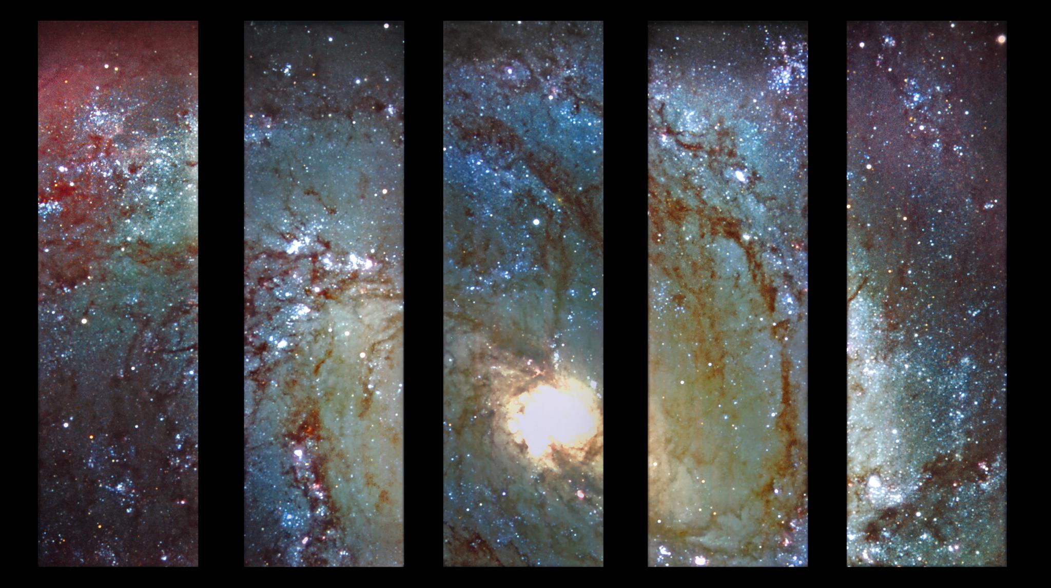 Les cinq fenêtres montrent la galaxie située dans la constellation australe de l’Hydre. Elle se trouve à environ 15 millions d’années-lumière, sa structure spirale est semblable à notre galaxie la Voie Lactée.